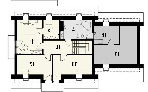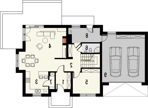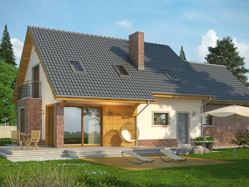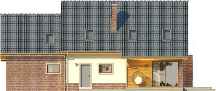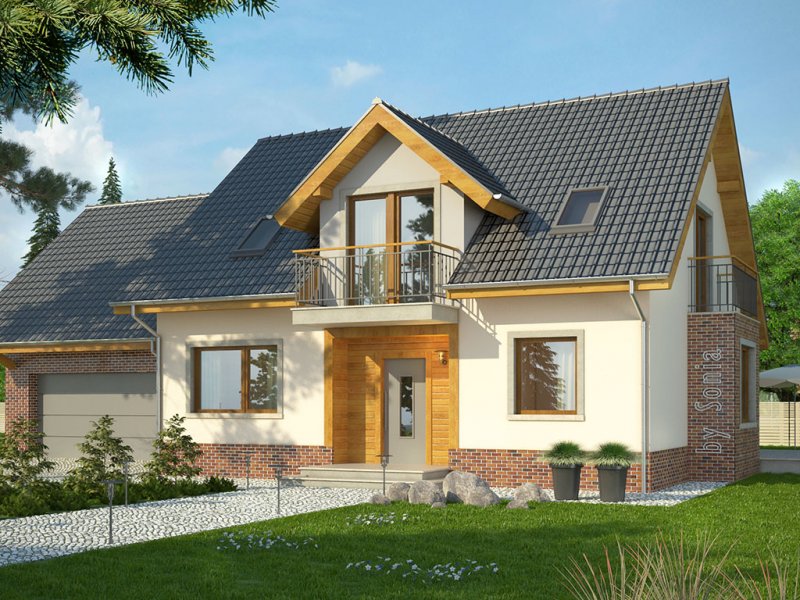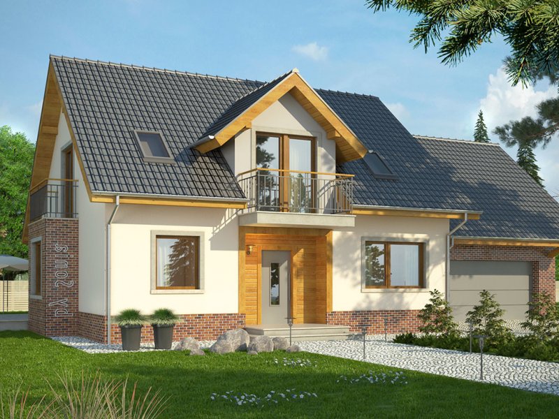 KOMFORT2G to niepodpiwniczony dom jednorodzinny z garażem na 2 auta. Oprócz garażu, naparterze znalazł się przestronny salon z jadalnią w wykuszu i otwartą kuchniąze spiżarką. Projekt przewiduje ponadto dodatkowy pokój, łazienkę ipomieszczenie gospodarcze. Na piętrze ulokowano 3 sypialnie – wszystkie zwyjściem na taras. Jedna z sypialni posiada dodatkowo wydzieloną garderobę. Złazienki przejść można do pralni, z której przejść można na strych.Urokliwezestawienie okładziny z płytek klinkierowych z białym tynkiem urozmaiconoelementami w okładzinie drewnianej. Bryła urozmaicona lukarną nad wejściem,wykuszem w elewacji bocznej oraz przedłużoną połacią dachu od strony ogrodu(pełniącą jednocześnie funkcję zadaszenia nad tarasem) jest atrakcyjna, ale napewno nie daje wrażenia przesytu.