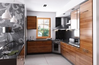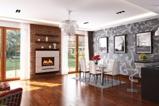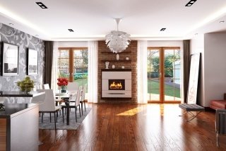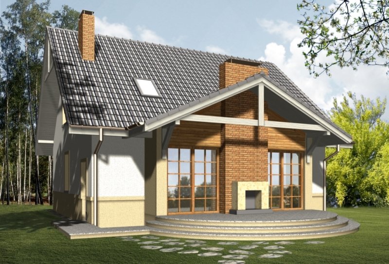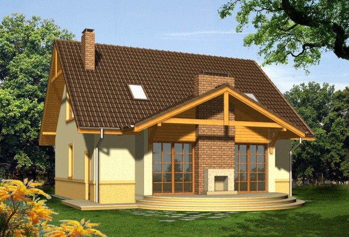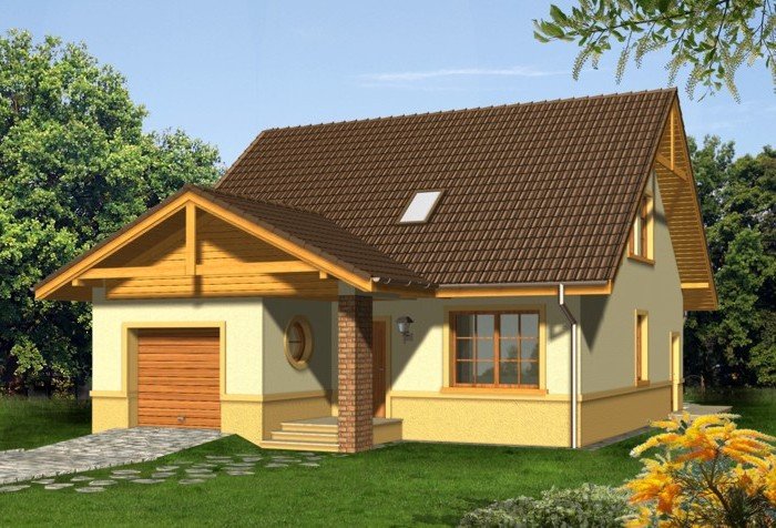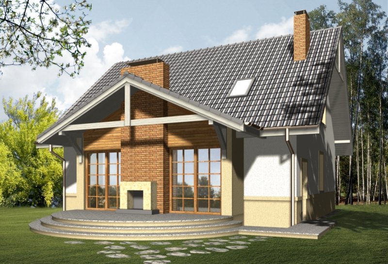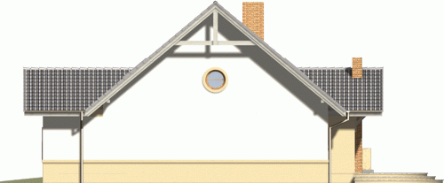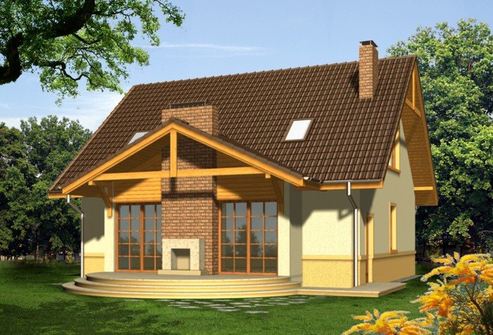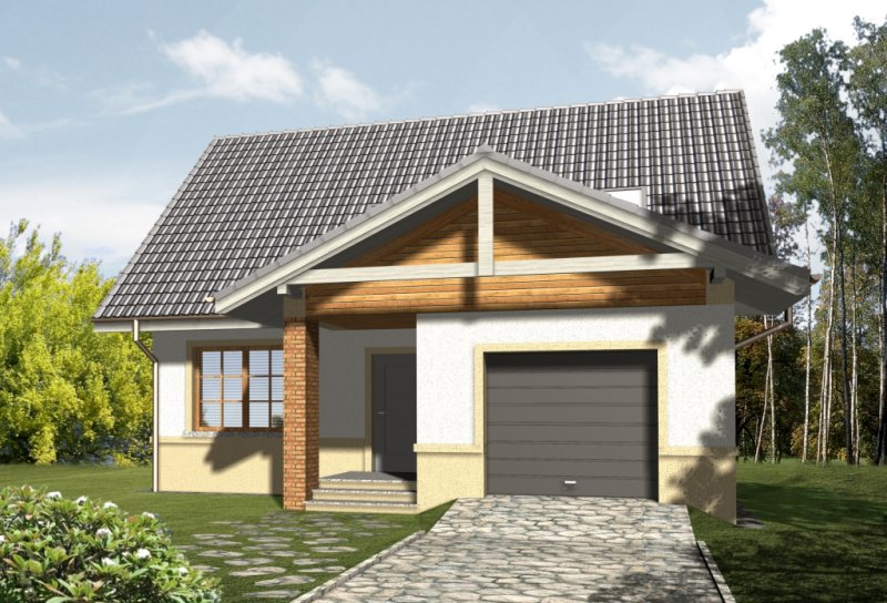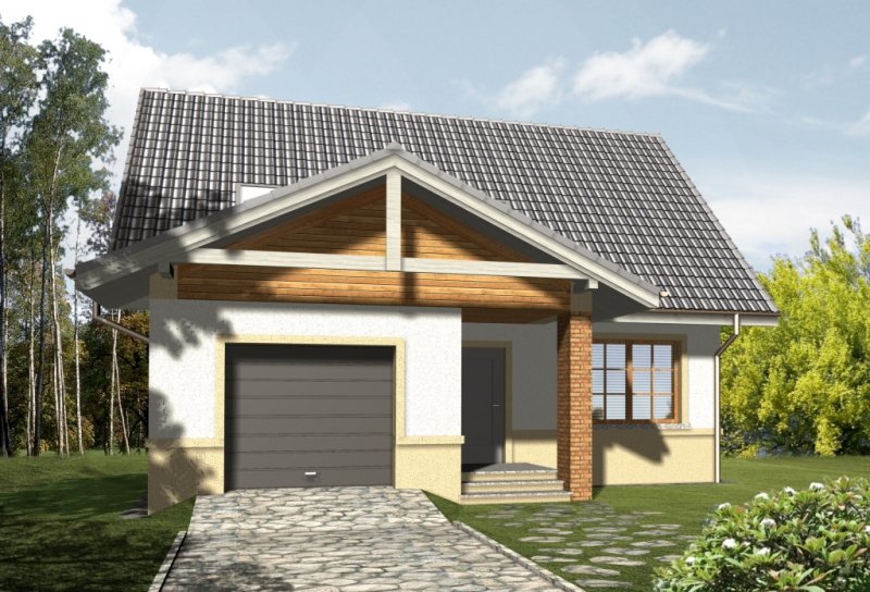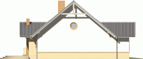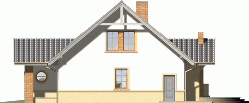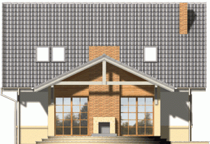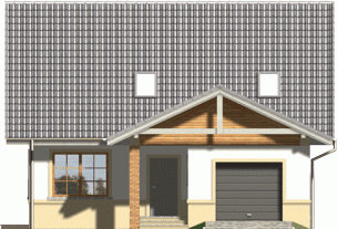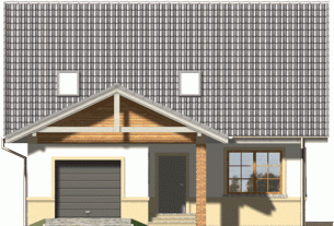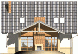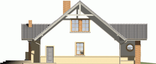 Ciekawy dom o głównej bryle przykrytej dwuspadowym dachem. Charakterystyczne jego elementy to widoczna na szczytach drewniana konstrukcja dachu, deskowanie fragmentów ścian oraz zadaszona strefa wejściowa z klinkierowym słupem. Otwory okienne podkreślone opaskami oraz cokół zwieńczony gzymsem doskonale uzupełniają plastycznie elewacje budynku.