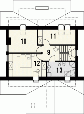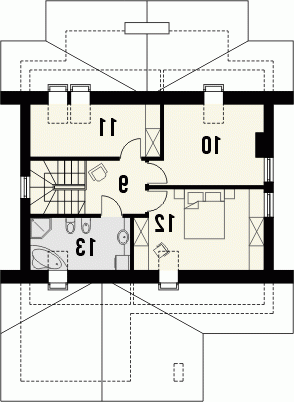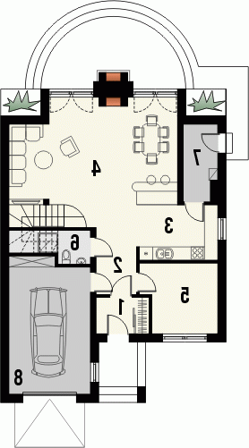 Budynek niepodpiwniczony piętrowy z garażem. Na parterze obok pokoju dziennego i otwartej kuchni z wejściem do pom. gospodarczego znajduje się dodatkowy pokój, łazienka i garaż. Na poddaszu pod dachem stromym zaprojektowano 3 sypialnie i łazienkę. Dokumentacja dostępna również w odbiciu lustrzanym.