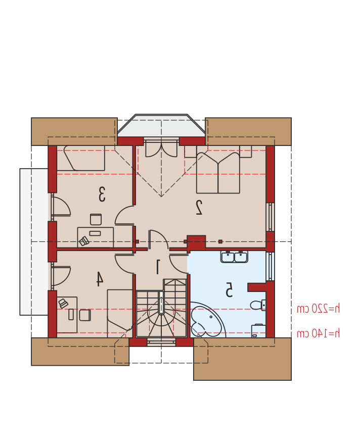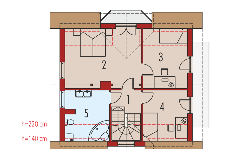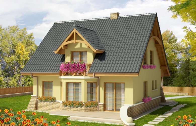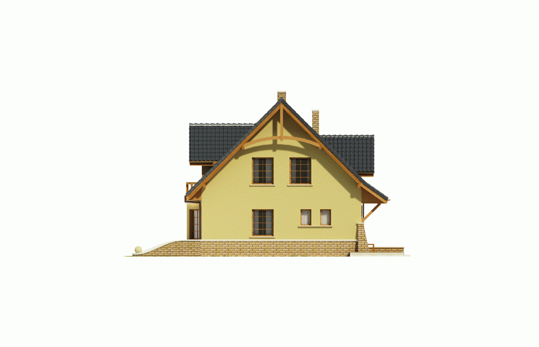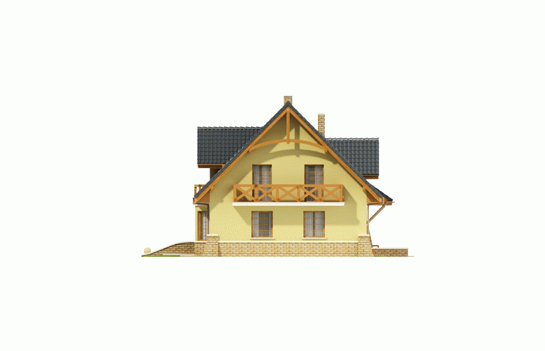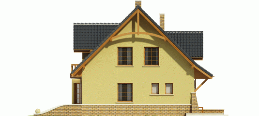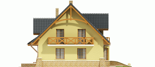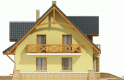 Dom parterowy z użytkowym poddaszem, niepodpiwniczony, przeznaczony dla 3-4-osobowej rodziny. Na parterze znajduje się strefa dzienna: przestronny salon, jadalnia w przeszklonym wykuszu, otwarta kuchnia, którą w łatwy sposób można oddzielić. Jest też gabinet z dużą garderobą, pomieszczenie gospodarcze oraz łazienka. Na poddaszu zaplanowano strefę nocną: trzy pokoje oraz bardzo wygodną łazienkę. Dom został zaprojektowany jako niedrogi w realizacji.