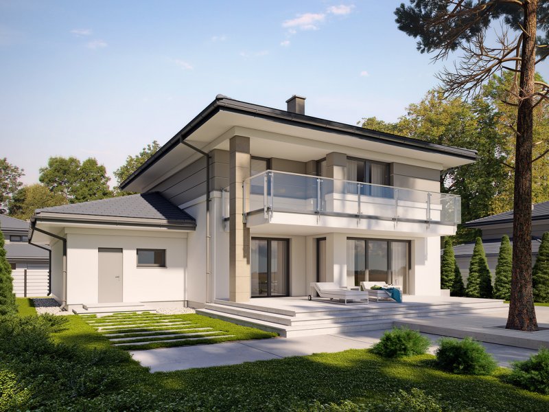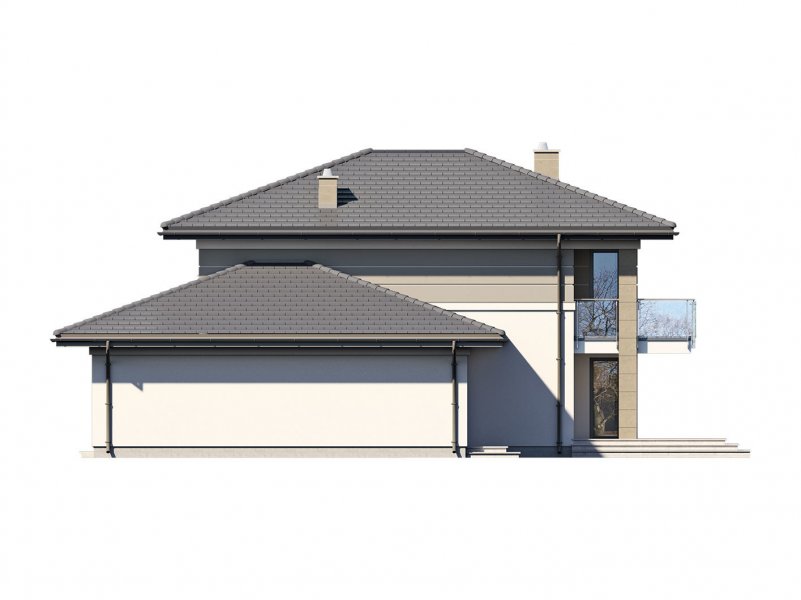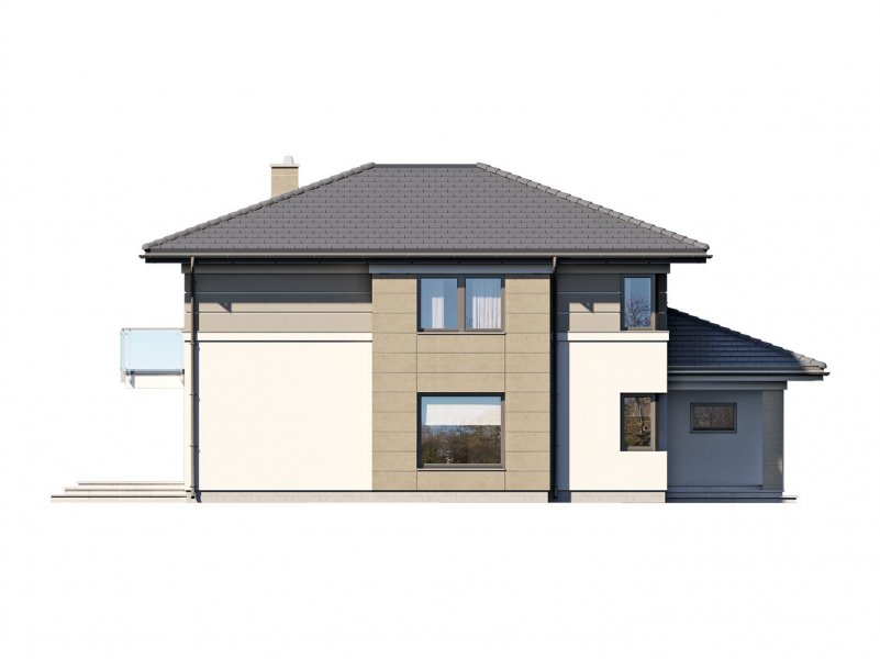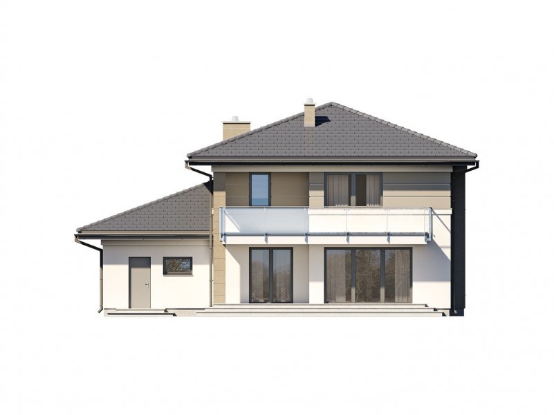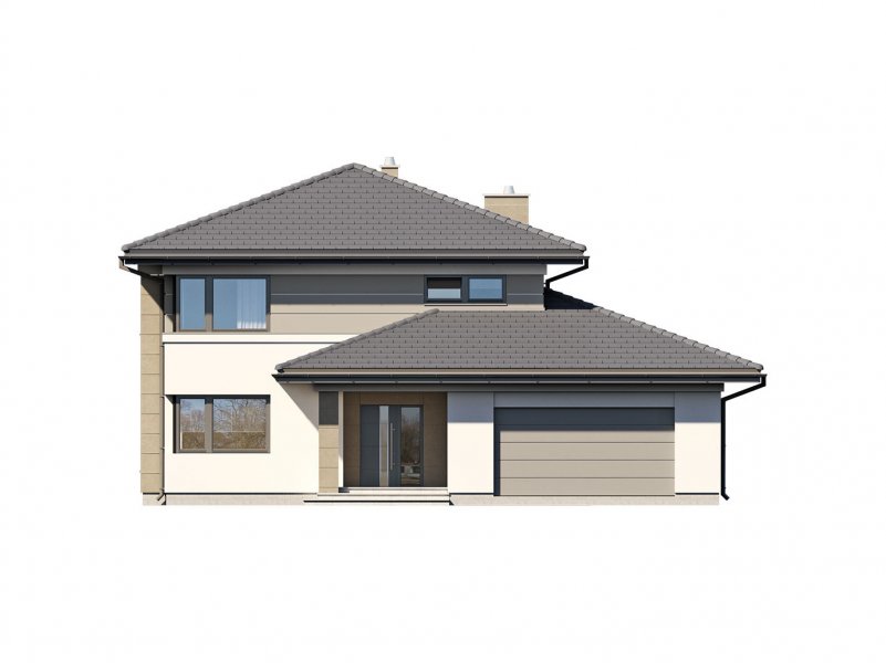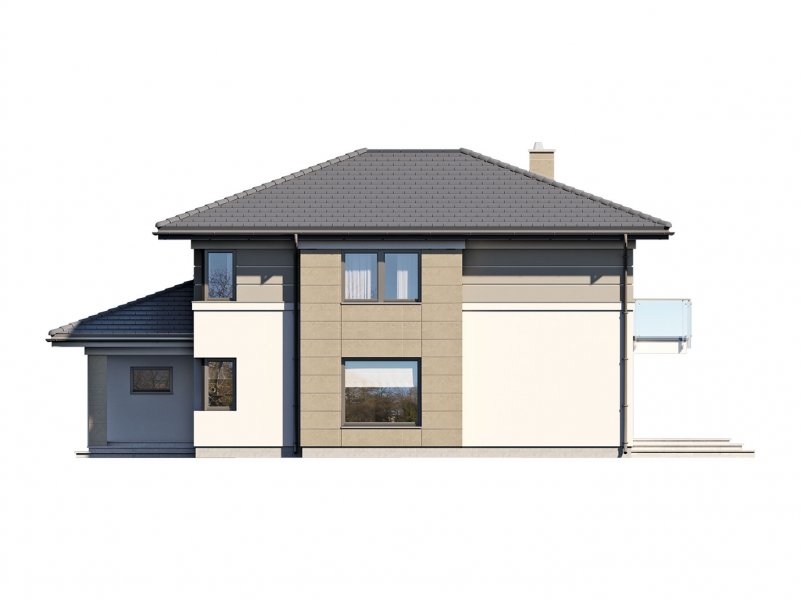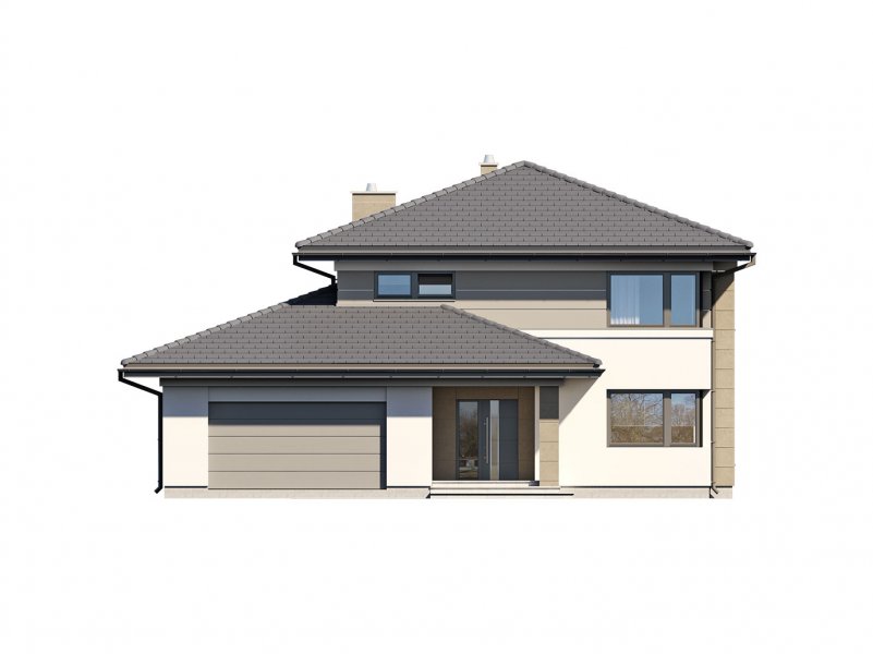 Korso 2, to projekt reprezentacyjnego domu piętrowego przeznaczonego dla 4-osobowej rodziny. Jest to typowo miejska rezydencja o nowoczesnym wyglądzie i optymalnej powierzchni użytkowej. Posiada bogaty program funkcjonalny, rozłożony na dwóch pełnych kondygnacyjnych, który zapewni komfort nawet dla wymagających inwestorów. Parter zaprojektowano jako otwartą przestrzeń dzienną, złożoną z połączonego salonu, jadalni i kuchni. Przewidziano tutaj także dodatkowy pokój, który można wykorzystać jako gabinet lub dodatkową sypialnię. Na parterze znajduje się również duża kotłownia, na każdy rodzaj paliwa oraz dwustanowiskowy garaż.Dzięki osłonięciu częściowo zadaszonych tarasów, uzyskano na tarasie prywatną strefę wypoczynku. Na piętrze zaprojektowano 3 sypialnie, łazienkę i pralnię. Główna sypialnia ma zapewnioną własną garderobę oraz łazienkę. Taką dodatkową przestrzeń można według potrzeb przerobić np. na kącik do pracy. Korso 2 zachwyca wysmakowaną, ponadczasową, klasyczną bryłą ujętą we współczesny elegancki wizerunek. Rezydencja ta stanowi doskonałą propozycję dla inwestorów poszukujących komfortowego domu w estetycznym wydaniu.