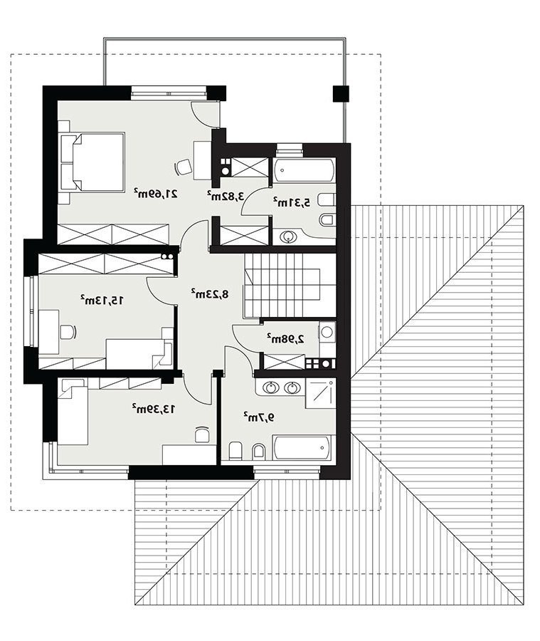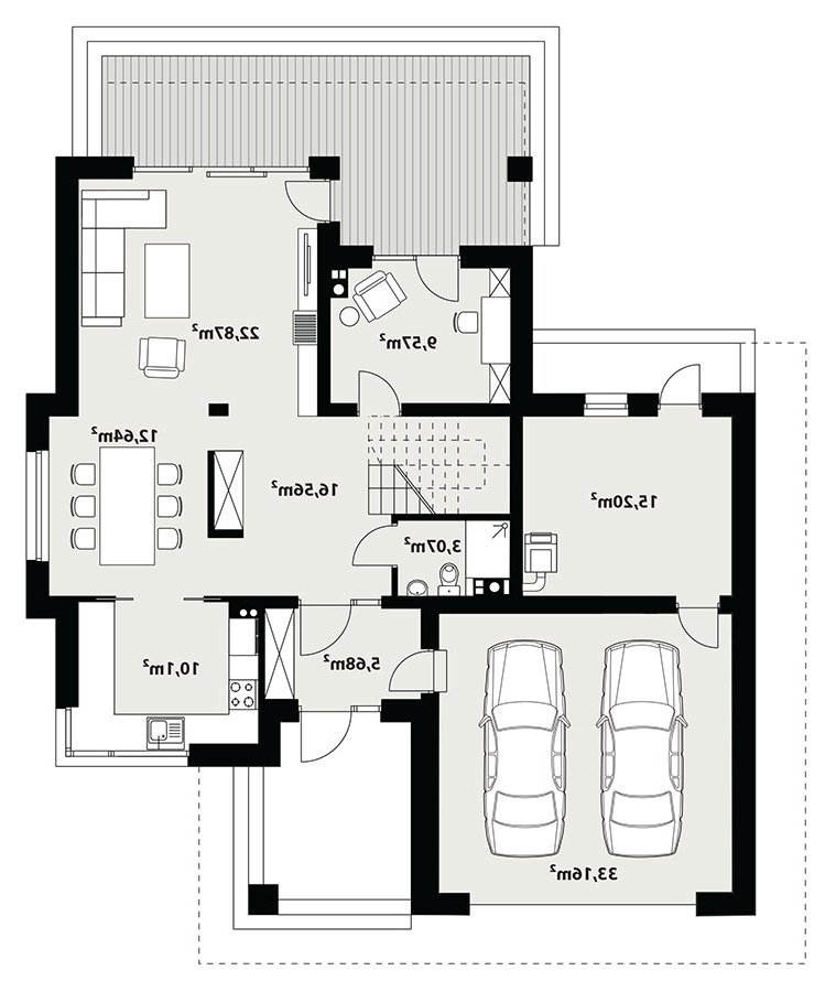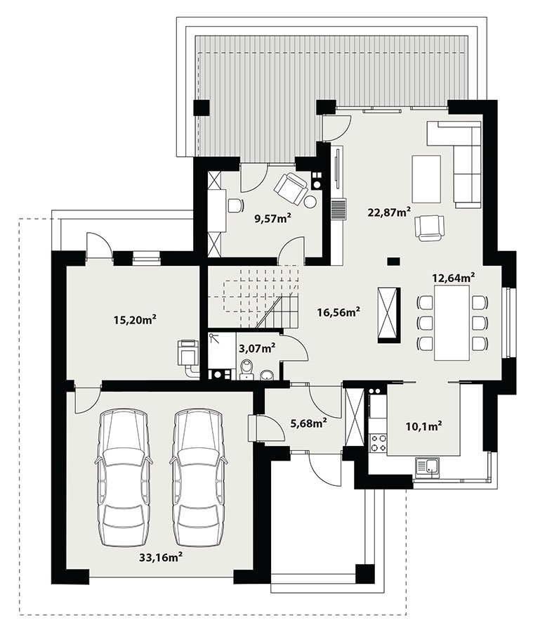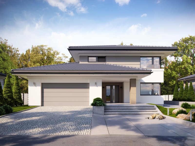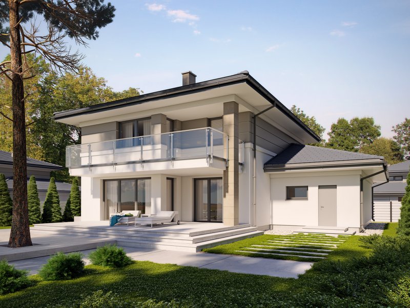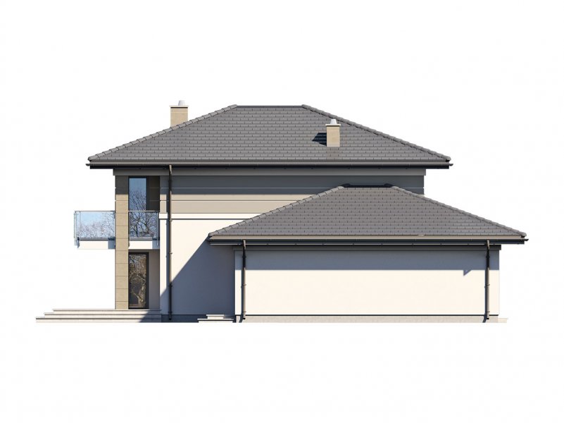 Korso 2, to projekt reprezentacyjnego domu piętrowego przeznaczonego dla 4-osobowej rodziny. Jest to typowo miejska rezydencja o nowoczesnym wyglądzie i optymalnej powierzchni użytkowej. Posiada bogaty program funkcjonalny, rozłożony na dwóch pełnych kondygnacyjnych, który zapewni komfort nawet dla wymagających inwestorów. Parter zaprojektowano jako otwartą przestrzeń dzienną, złożoną z połączonego salonu, jadalni i kuchni. Przewidziano tutaj także dodatkowy pokój, który można wykorzystać jako gabinet lub dodatkową sypialnię. Na parterze znajduje się również duża kotłownia, na każdy rodzaj paliwa oraz dwustanowiskowy garaż.Dzięki osłonięciu częściowo zadaszonych tarasów, uzyskano na tarasie prywatną strefę wypoczynku. Na piętrze zaprojektowano 3 sypialnie, łazienkę i pralnię. Główna sypialnia ma zapewnioną własną garderobę oraz łazienkę. Taką dodatkową przestrzeń można według potrzeb przerobić np. na kącik do pracy. Korso 2 zachwyca wysmakowaną, ponadczasową, klasyczną bryłą ujętą we współczesny elegancki wizerunek. Rezydencja ta stanowi doskonałą propozycję dla inwestorów poszukujących komfortowego domu w estetycznym wydaniu.