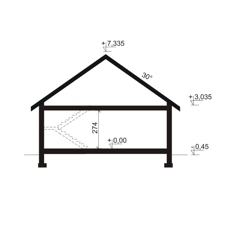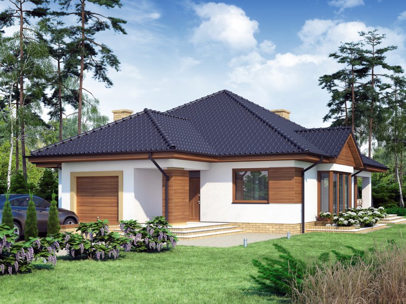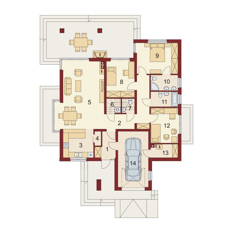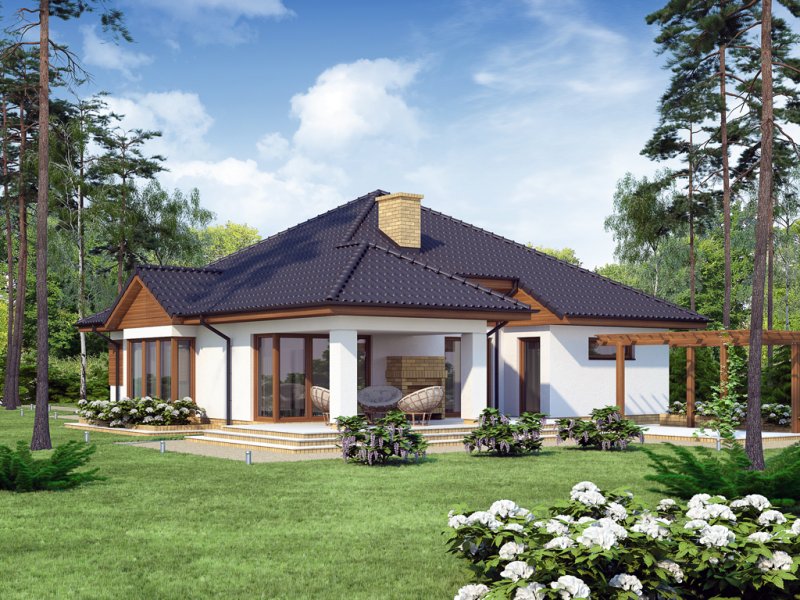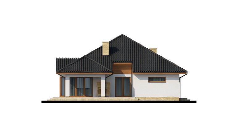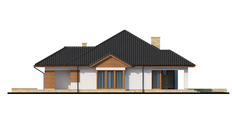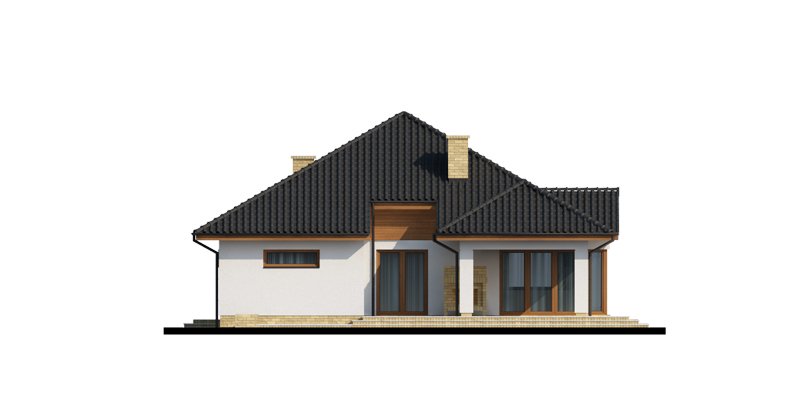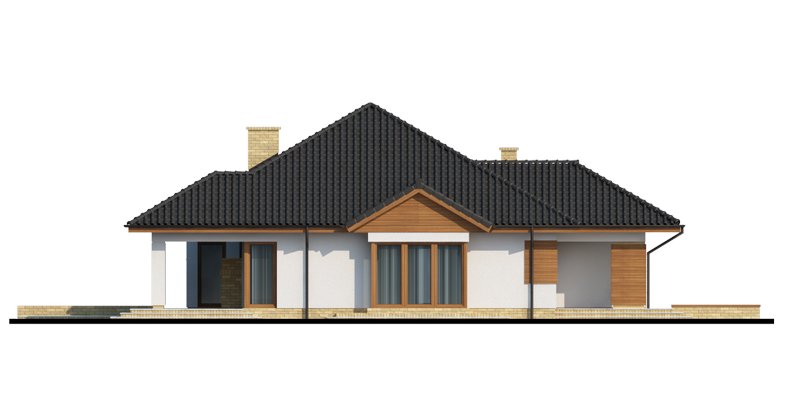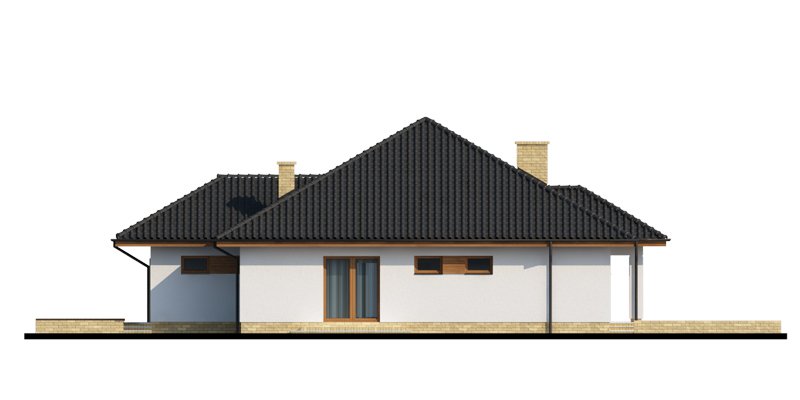 Pierwszą strefę tworzą przestronny pokój dzienny płynnie przechodzący w osadzoną w wykuszu jadalnię oraz otwarta kuchnia połączona z podręczną spiżarnią; drugą strefę - dwa ustawne pokoje, wygodna łazienka i dwuosobowa sypialnia z niezależnym pokojem kąpielowym. Dodatkowo w domu znajdują się: osobne pomieszczenie pralni, łatwo dostępna z części dziennej toaleta, kotłownia i jednostanowiskowy garaż z przejściem do wiatrołapu.