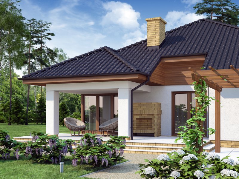 Wykorzystane na elewacji drewno i płytki klinkierowe podkreślają nowoczesny charakter domu. Gwarantujące doskonałe naturalne oświetlenie i wentylację duże przeszklenia wraz z rozległym, w części zadaszonym tarasem z zewnętrznym grillem – umożliwiają integrację wnętrza z otaczającym ogrodem.