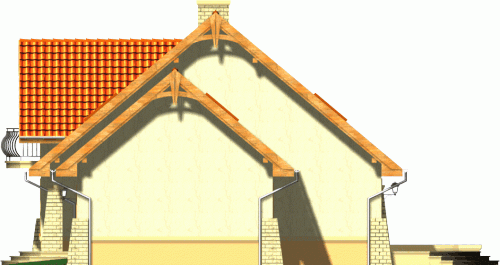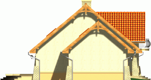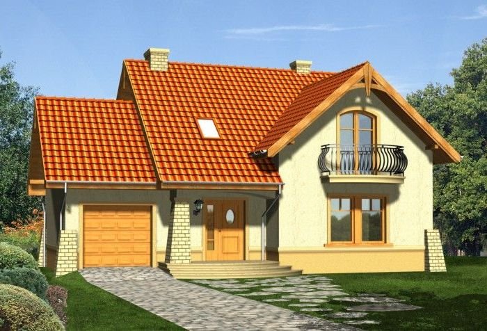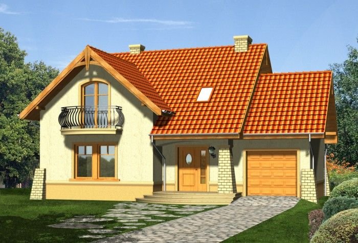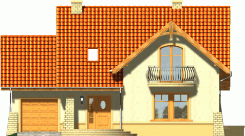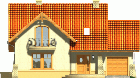 Klasyczny dom z dachem dwuspadowym z bryłą garażu dostawioną z boku. Front budynku przykuwa uwagę reprezentacyjnym wejściem i atrakcyjnym balkonem z sypialni na poddaszu. Od strony ogrodu do budynku przylega częściowo zadaszony taras.
