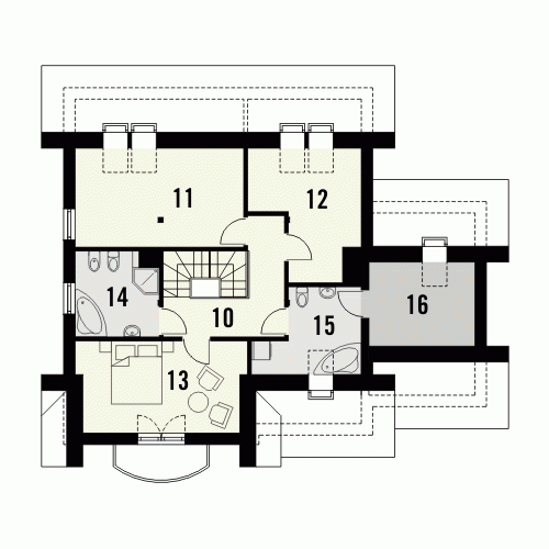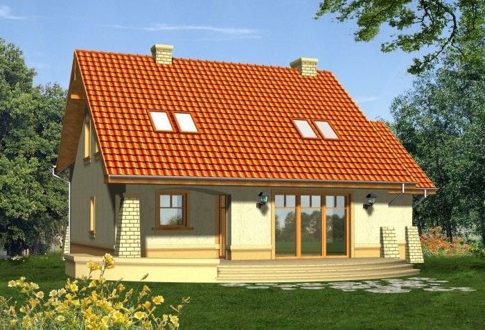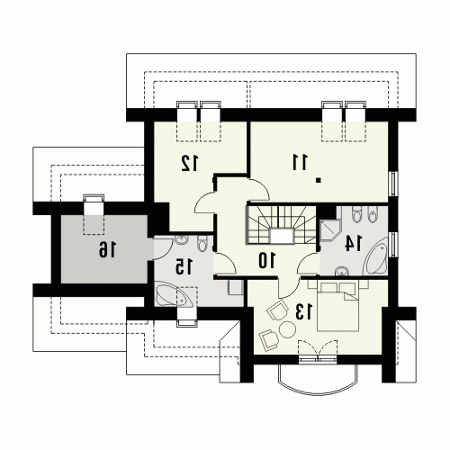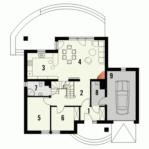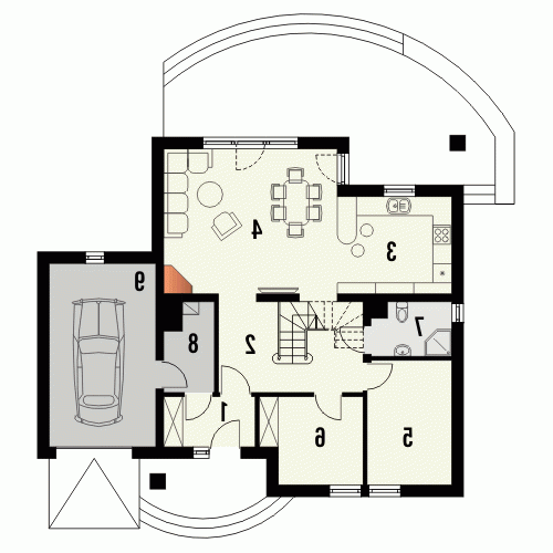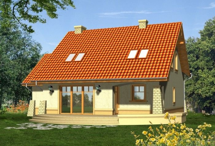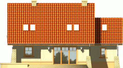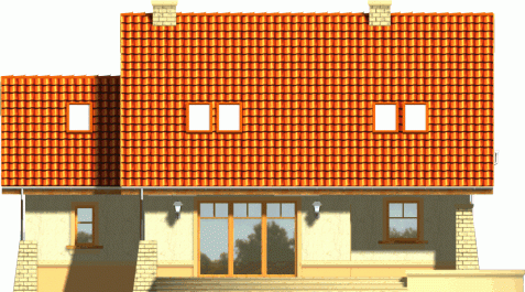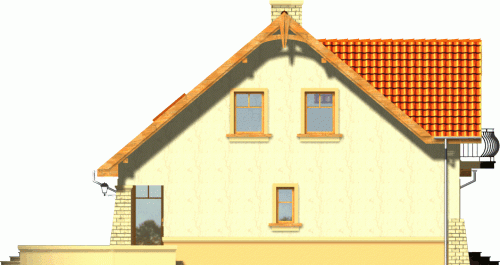 Budynek niepodpiwniczony piętrowy z garażem lub bez. Na parterze zaprojektowano pokój dzienny z jadalnią, kuchnię, pom. gospodarcze i wc oraz dodatkowe dwa pokoje. Na poddaszu znajdują się trzy pokoje w tym jeden z dużym łukowym oknem oraz dwie łazienki. Dokumentacja dostępna również w odbiciu lustrzanym.