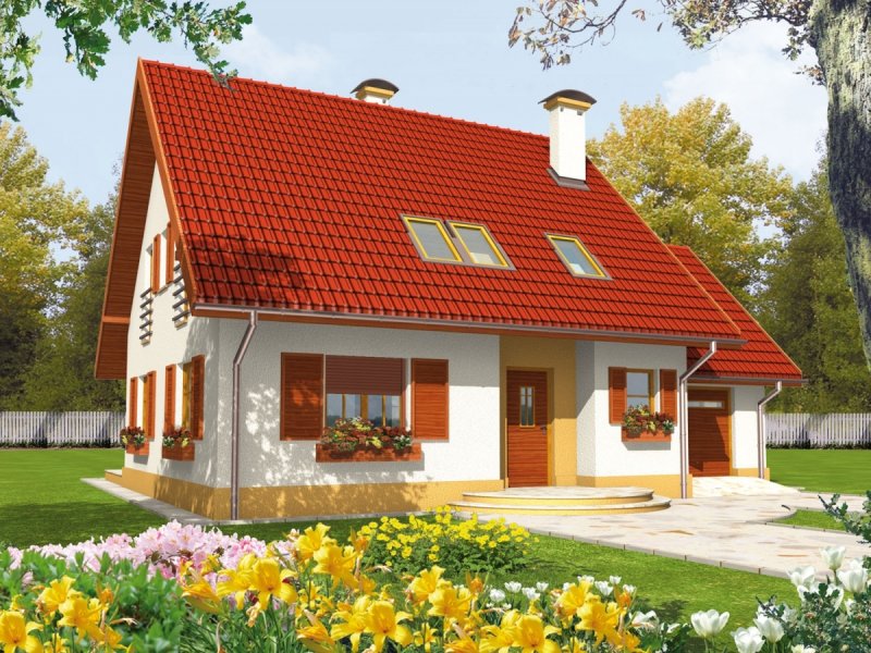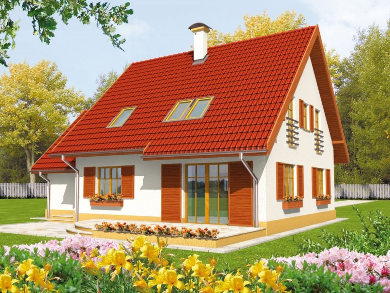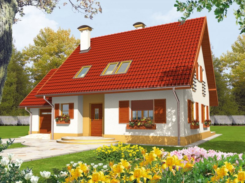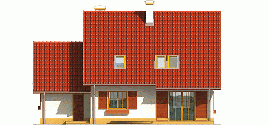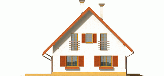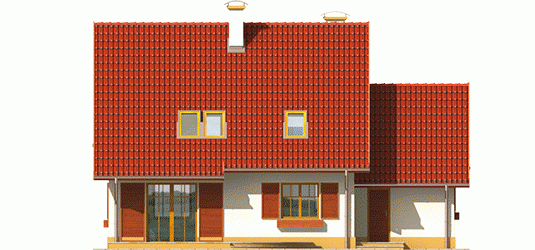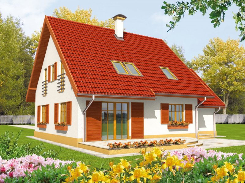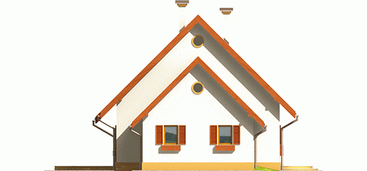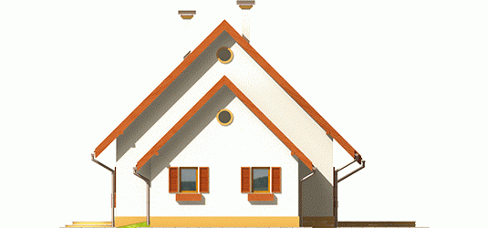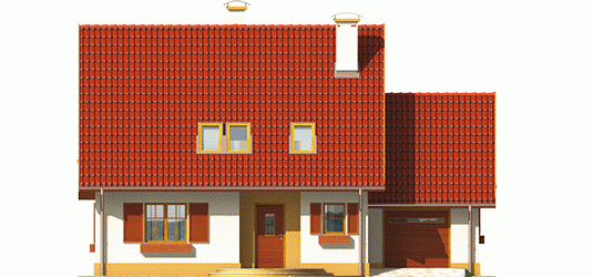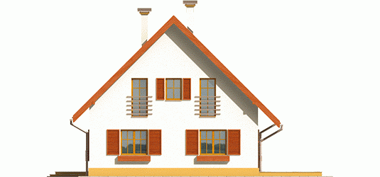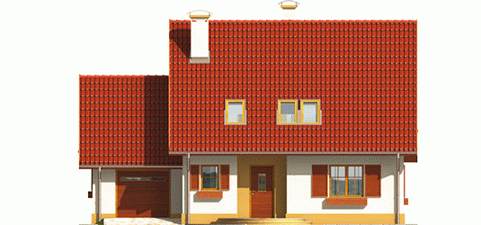 Dom parterowy z poddaszem użytkowym, niepodpiwniczony, przeznaczony dla 4-osobowej rodziny. Wyraźnie wydzielona strefa wejściowa to wygodny wiatrołap, przejściowe pomieszczenie gospodarcze, hol i toaleta. Pozostałą część parteru stanowi duży salon wraz z otwartą kuchnią i jadalnią oraz centralnie umieszczonym kominkiem. Na poddaszu znajduje się część nocna składająca się z trzech sypialń i łazienki. Dodatkowym atutem budynku jest możliwość wykorzystania części nad garażem do celów gospodarczych. Ciekawe i estetyczne wykończenie domu sprawia, że nie tylko dobrze się on prezentuje, ale również jest bardzo przytulny i wygodny.