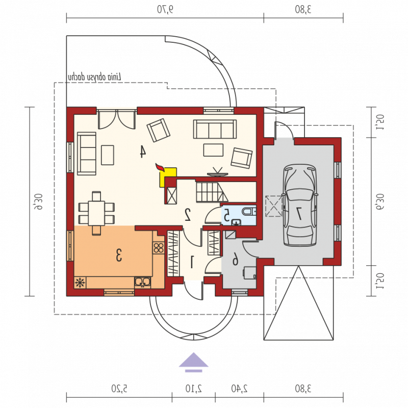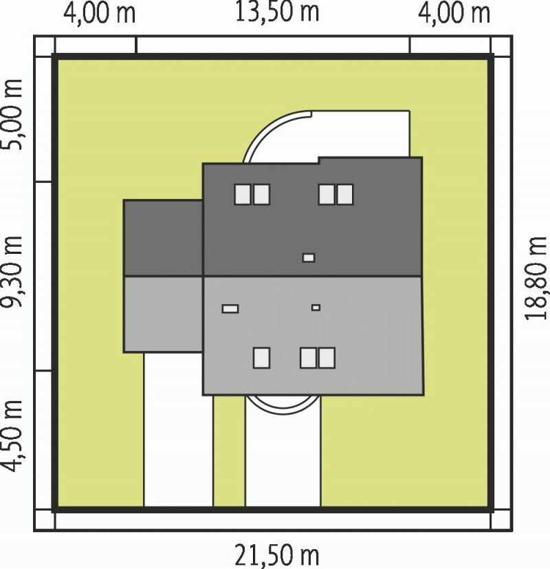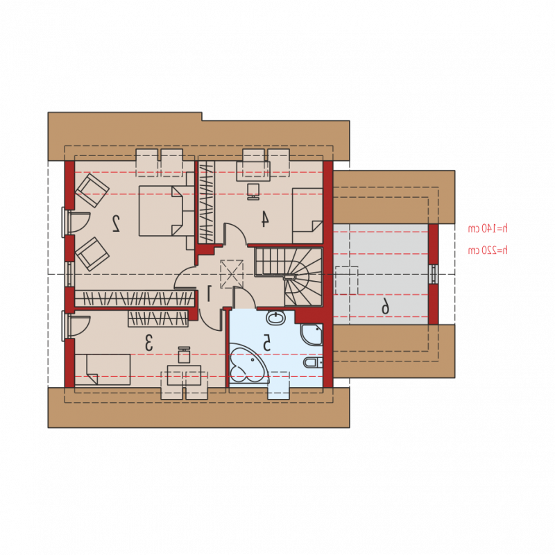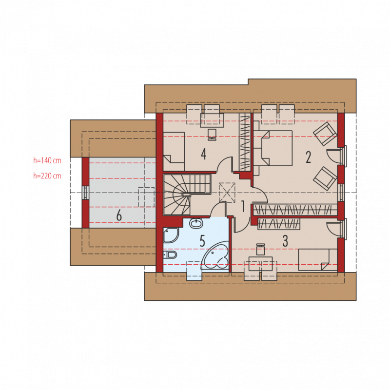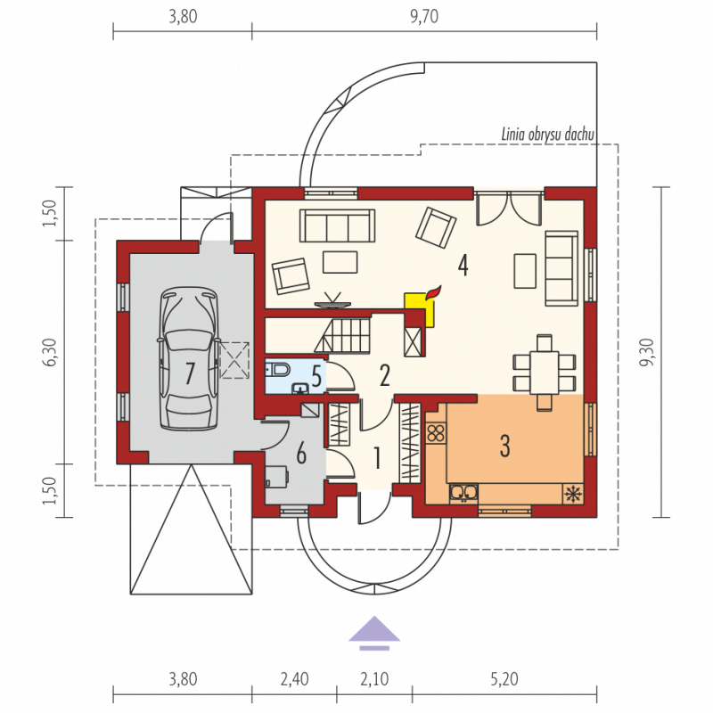 Dom parterowy z poddaszem użytkowym, niepodpiwniczony, przeznaczony dla 4-osobowej rodziny. Wyraźnie wydzielona strefa wejściowa to wygodny wiatrołap, przejściowe pomieszczenie gospodarcze, hol i toaleta. Pozostałą część parteru stanowi duży salon wraz z otwartą kuchnią i jadalnią oraz centralnie umieszczonym kominkiem. Na poddaszu znajduje się część nocna składająca się z trzech sypialń i łazienki. Dodatkowym atutem budynku jest możliwość wykorzystania części nad garażem do celów gospodarczych. Ciekawe i estetyczne wykończenie domu sprawia, że nie tylko dobrze się on prezentuje, ale również jest bardzo przytulny i wygodny.
