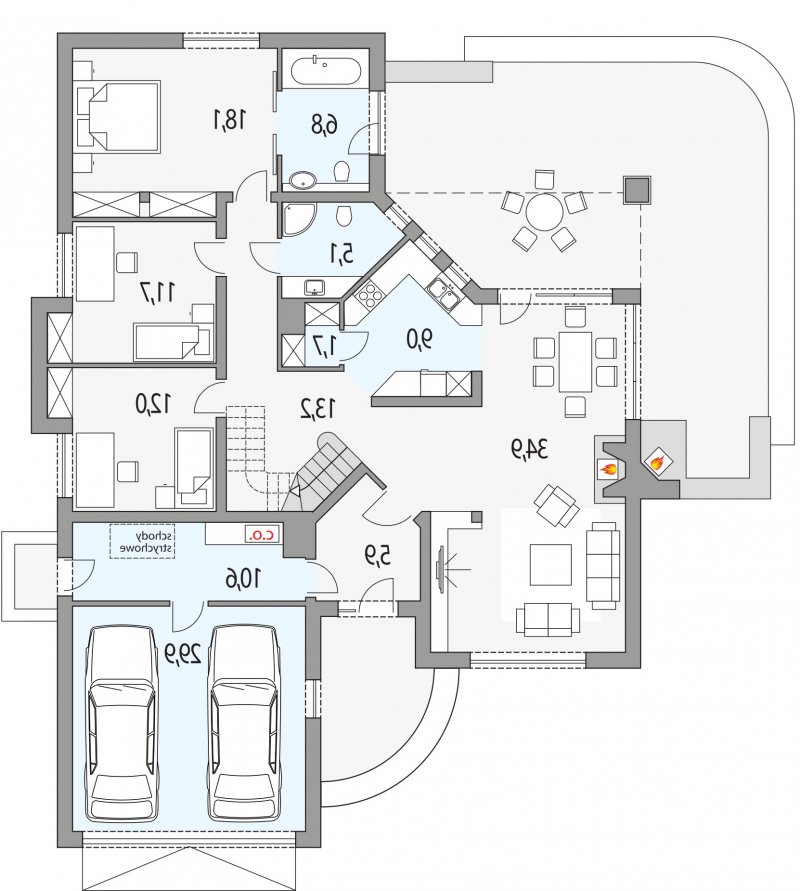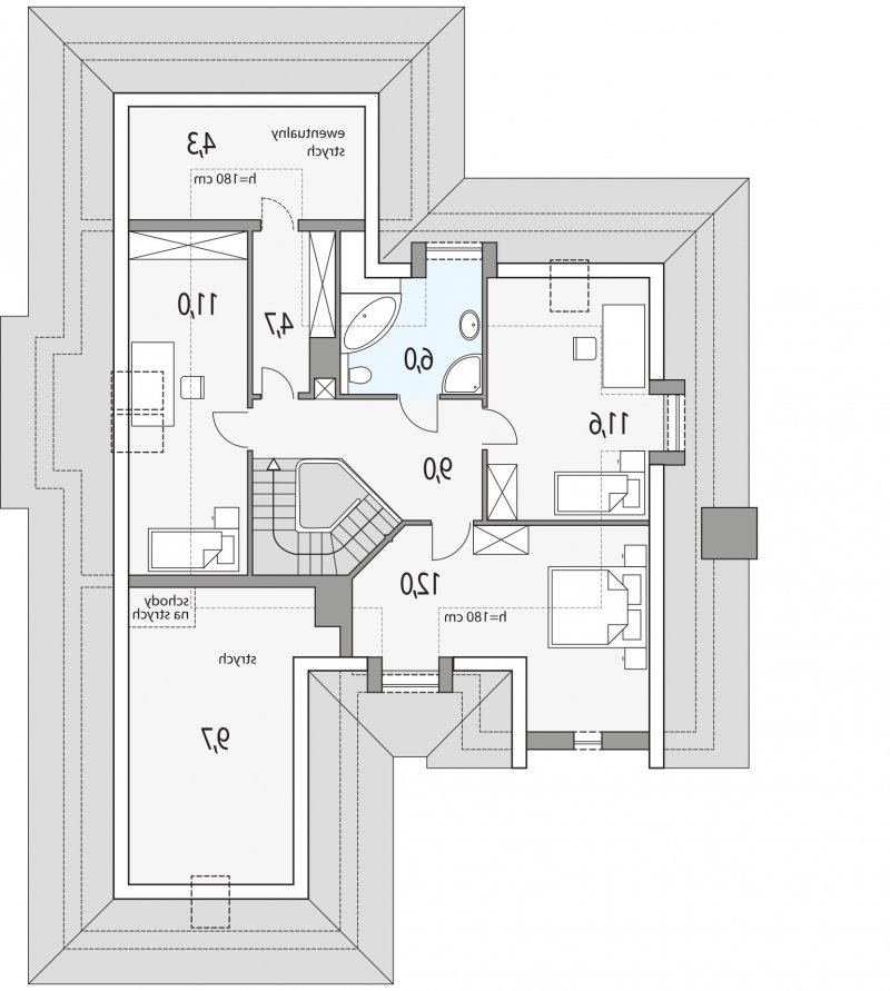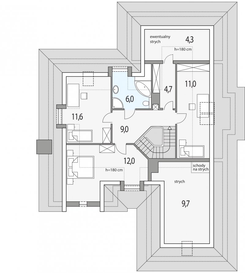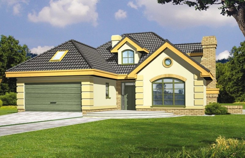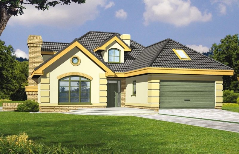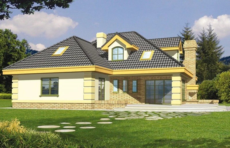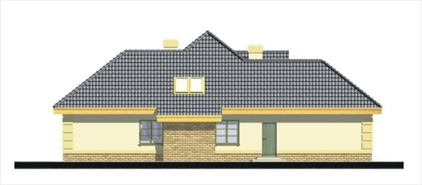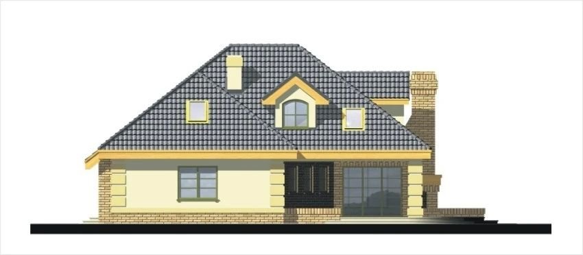 Elegancki dom przeznaczony dla 4-6-osobowej rodziny. Niepodpiwniczony z poddaszem użytkowym. Na parterze w części dziennej dominującą rolę spełnia salon z pięknym kominkiem. Doświetlenie pokoju dziennego od strony wjazdu pozwala umiejscowić dom również na działce z wjazdem od południa. Duże okna zapewniają przenikanie się domu z ogrodem. Podobną funkcję spełniają drzwi na taras z łazienki koło sypialni - można ją ciekawie zaaranżować jako pokój kąpielowy. Trzy sypialnie na parterze pozwalają na etapowanie budowy i wykończenie poddasza w późniejszym terminie.