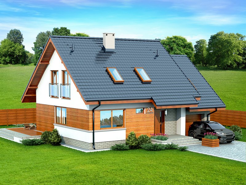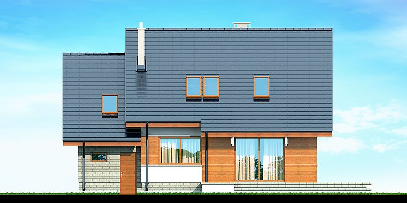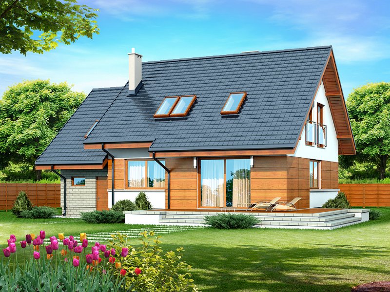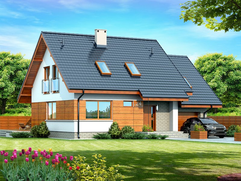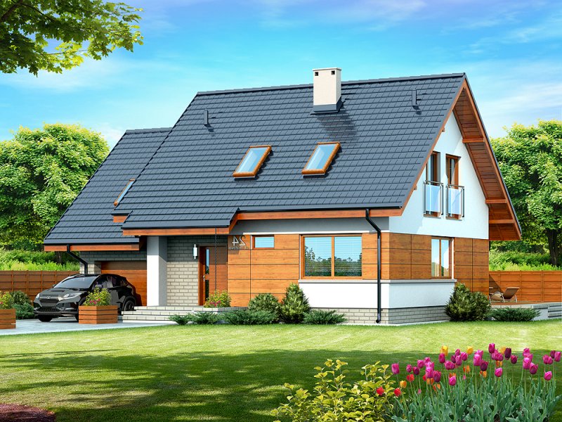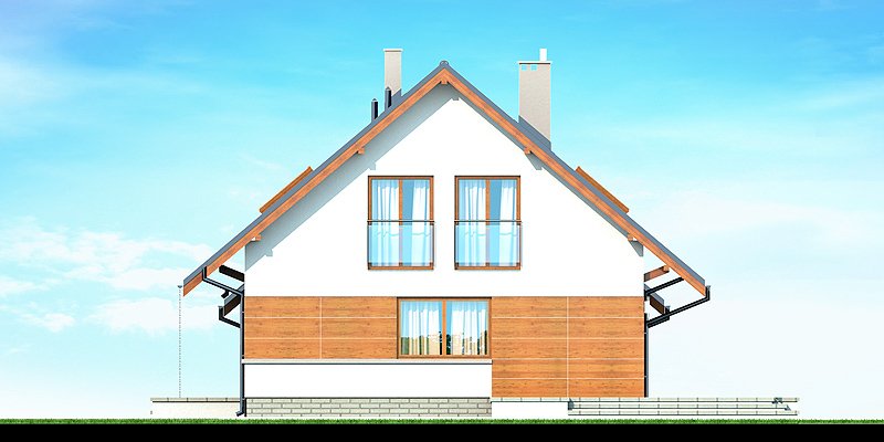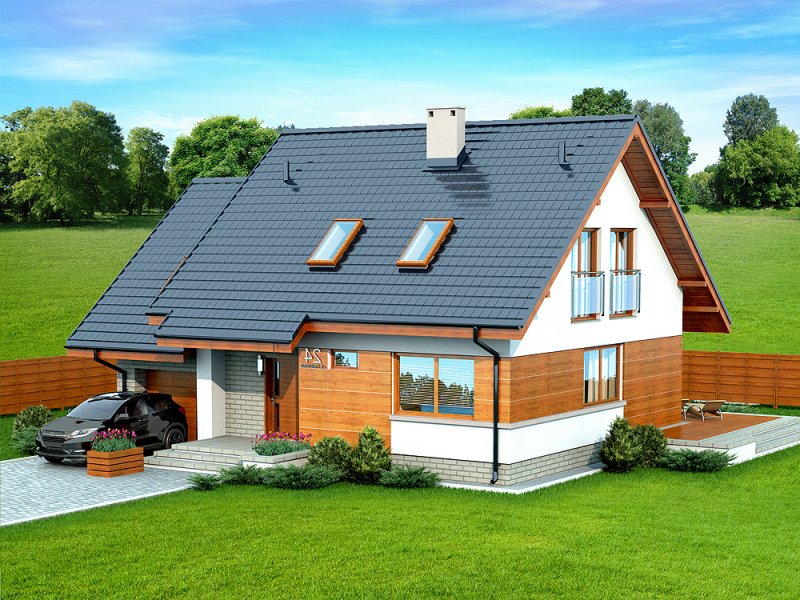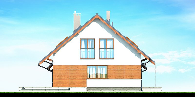 LISANDRA MAŁA to atrakcyjny i funkcjonalny dom przeznaczony dla 3-6 osobowej rodziny o eleganckiej formie i współczesnej estetyce oraz prostej i taniej, dokładnie przemyślanej konstrukcji. Jest to dom parterowy z użytkowym poddaszem, niepodpiwniczony, z garażem jednostanowiskowym. Na parterze zlokalizowana jest wygodna strefa dzienna składająca się z kuchni (która w zależności od potrzeb może być zamykana lub otwarta) jadalni oraz salonu otwartego na taras i ogród. Dzięki doświetleniu strefy dziennej zarówno od strony ogrodu jak i z boku od strony jadalni, dom nadaje się na każdą działkę, zarówno z wjazdem od północy jak i od południa, wschodu bądź zachodu. Uzupełnieniem kuchni jest pojemna spiżarka. Dodatkowo na parterze zaprojektowano pokój, który może służyć jako pokój gościnny, gabinet czy pokój najstarszego członka rodziny, łazienkę i garaż bezpośrednio połączony z wiatrołapem oraz kotłownię dostępną z garażu z wyjściem na ogród dzięki czemu może ona stanowić też miejsce składowania narzędzi ogrodowych. W wiatrołapie przewidziano miejsce na szafy przez co pełni on dodatkową rolę pojemnej garderoby / szatni. Na poddaszu znalazły się trzy wygodne pokoje oraz funkcjonalna łazienka z wanną i kabiną prysznicową oraz pralką. Strych dostępny jest z półpiętra, może on być przeznaczony na dodatkowy pokój, garderobę, pralnię, siłownię, saunę czy salę z kinem domowym. W projektowaniu Lisandry Małej szczególną uwagę zwrócono na atrakcyjny wygląd zewnętrzny, proporcjonalność bryły budynku, odpowiednie doświetlenie i funkcjonalne rozplanowanie pomieszczeń przy zachowaniu prostoty konstrukcji oraz zwartości bryły domu. Dom zaprojektowano jako energooszczędny