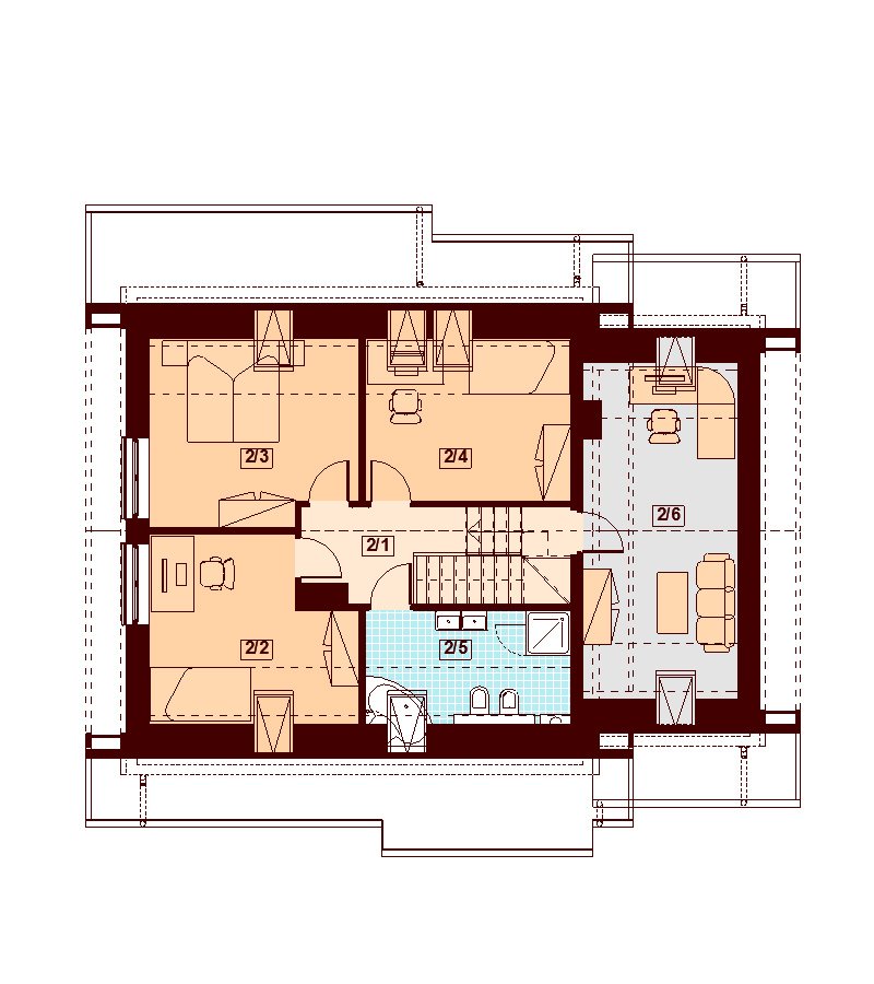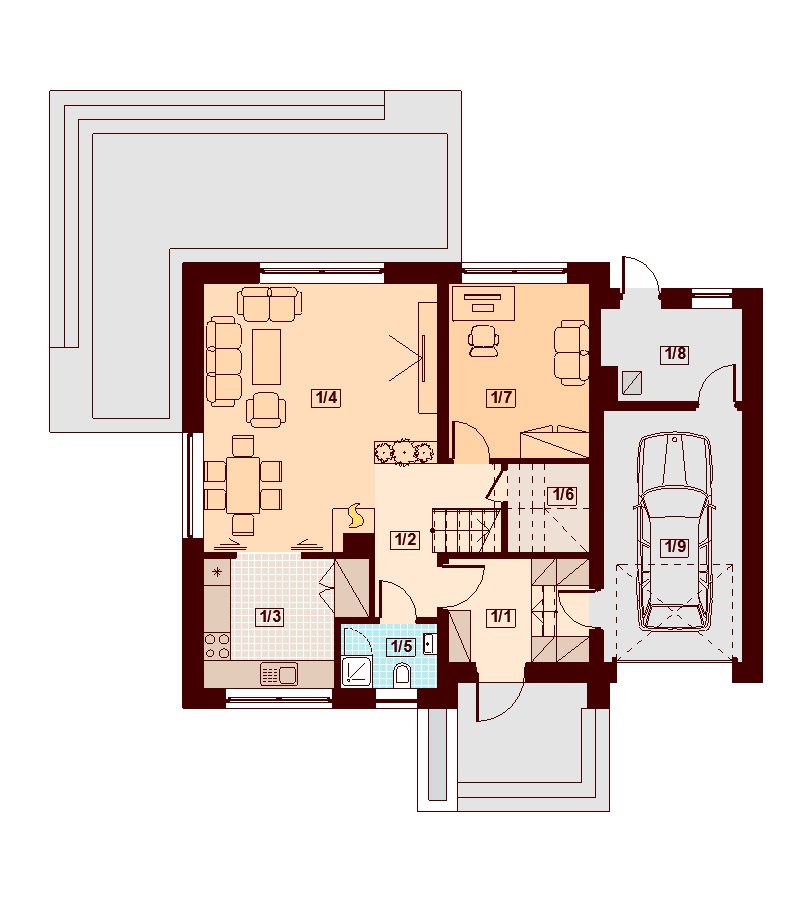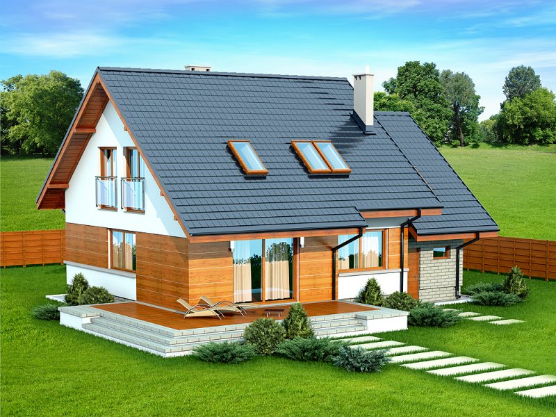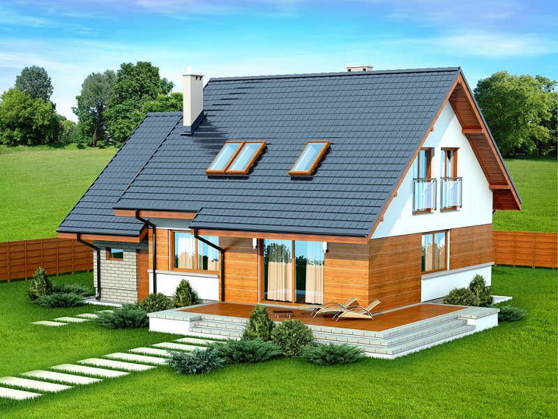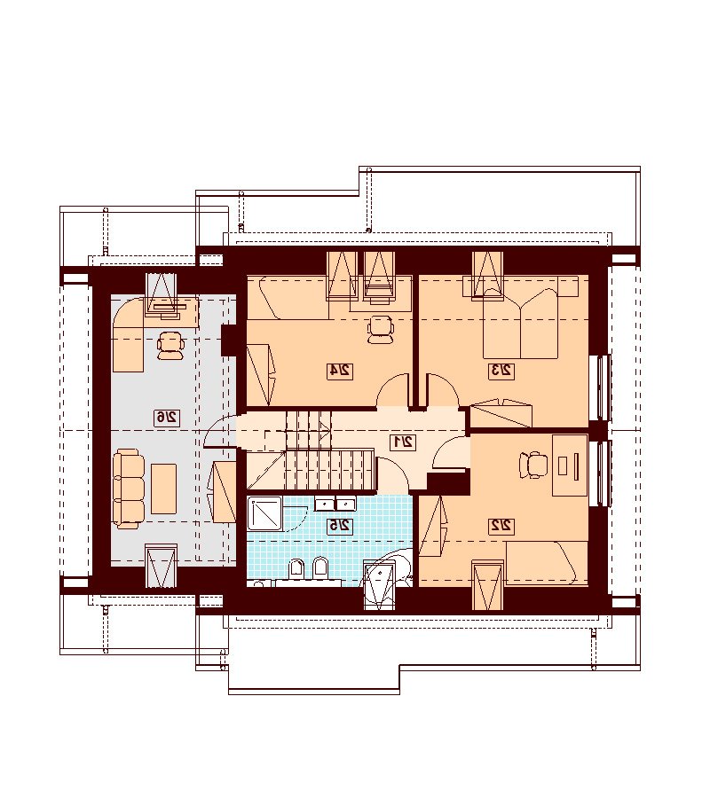 LISANDRA MAŁA to atrakcyjny i funkcjonalny dom przeznaczony dla 3-6 osobowej rodziny o eleganckiej formie i współczesnej estetyce oraz prostej i taniej, dokładnie przemyślanej konstrukcji. Jest to dom parterowy z użytkowym poddaszem, niepodpiwniczony, z garażem jednostanowiskowym. Na parterze zlokalizowana jest wygodna strefa dzienna składająca się z kuchni (która w zależności od potrzeb może być zamykana lub otwarta) jadalni oraz salonu otwartego na taras i ogród. Dzięki doświetleniu strefy dziennej zarówno od strony ogrodu jak i z boku od strony jadalni, dom nadaje się na każdą działkę, zarówno z wjazdem od północy jak i od południa, wschodu bądź zachodu. Uzupełnieniem kuchni jest pojemna spiżarka. Dodatkowo na parterze zaprojektowano pokój, który może służyć jako pokój gościnny, gabinet czy pokój najstarszego członka rodziny, łazienkę i garaż bezpośrednio połączony z wiatrołapem oraz kotłownię dostępną z garażu z wyjściem na ogród dzięki czemu może ona stanowić też miejsce składowania narzędzi ogrodowych. W wiatrołapie przewidziano miejsce na szafy przez co pełni on dodatkową rolę pojemnej garderoby / szatni. Na poddaszu znalazły się trzy wygodne pokoje oraz funkcjonalna łazienka z wanną i kabiną prysznicową oraz pralką. Strych dostępny jest z półpiętra, może on być przeznaczony na dodatkowy pokój, garderobę, pralnię, siłownię, saunę czy salę z kinem domowym. W projektowaniu Lisandry Małej szczególną uwagę zwrócono na atrakcyjny wygląd zewnętrzny, proporcjonalność bryły budynku, odpowiednie doświetlenie i funkcjonalne rozplanowanie pomieszczeń przy zachowaniu prostoty konstrukcji oraz zwartości bryły domu. Dom zaprojektowano jako energooszczędny