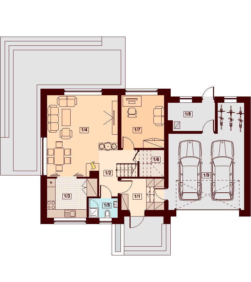 Lisandra Mała 2M to atrakcyjny i funkcjonalny dom przeznaczony dla 3-6 osobowej rodziny o eleganckiej formie i współczesnej estetyce oraz prostej i taniej, dokładnie przemyślanej konstrukcji. Jest to dom parterowy z użytkowym poddaszem, niepodpiwniczony, z garażem dwustanowiskowym. Na parterze zlokalizowana jest wygodna strefa dzienna składająca się z kuchni (która w zależności od potrzeb może być zamykana lub otwarta), jadalni oraz salonu otwartego na taras i ogród. Dzięki doświetleniu strefy dziennej zarówno od strony ogrodu jak i z boku od strony jadalni, dom nadaje się na każdą działkę, zarówno z wjazdem od północy jak i od południa, wschodu bądź zachodu. Uzupełnieniem kuchni jest pojemna spiżarka. Dodatkowo na parterze zaprojektowano pokój, który może służyć jako pokój gościnny, gabinet czy pokój najstarszego członka rodziny, łazienkę i garaż bezpośrednio połączony z wiatrołapem oraz kotłownię dostępną z garażu z wyjściem na ogród, dzięki czemu może ona stanowić też miejsce składowania narzędzi ogrodowych. W wiatrołapie przewidziano miejsce na szafy, przez co pełni on dodatkową rolę pojemnej garderoby / szatni. Na poddaszu znalazły się trzy wygodne pokoje oraz funkcjonalna łazienka z wanną i kabiną prysznicową oraz pralką. Strych dostępny jest z półpiętra, może on być przeznaczony na dodatkowy pokój, garderobę, pralnię, siłownię, saunę czy salę z kinem domowym. Strych może zostać też podzielony na kilka pomieszczeń o różnych funkcjach. W projektowaniu Lisandry Małej 2M szczególną uwagę zwrócono na atrakcyjny wygląd zewnętrzny, proporcjonalność bryły budynku, odpowiednie doświetlenie i funkcjonalne rozplanowanie pomieszczeń przy zachowaniu prostoty konstrukcji oraz zwartości bryły domu. Dom zaprojektowano jako energooszczędny.