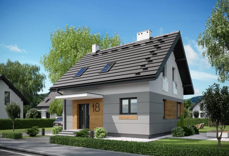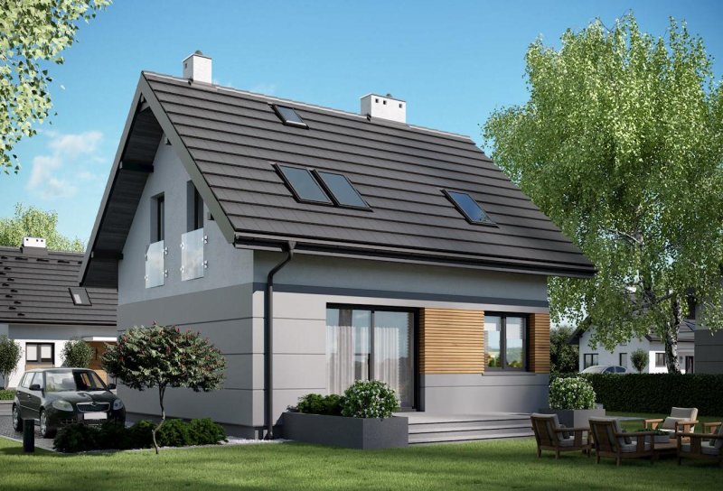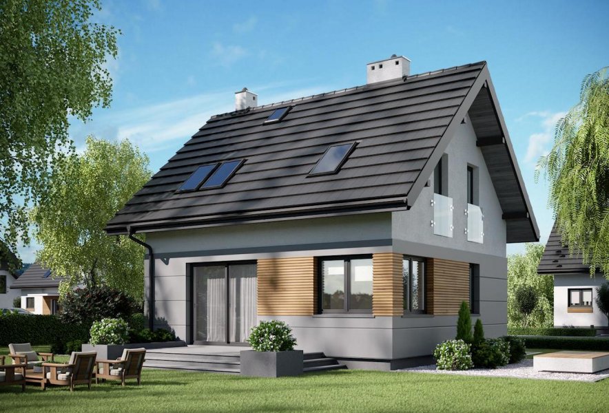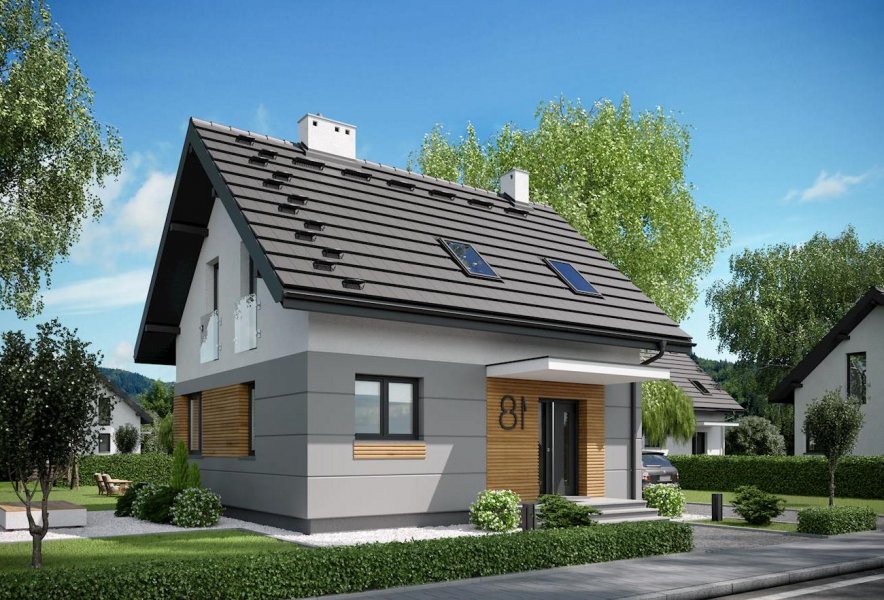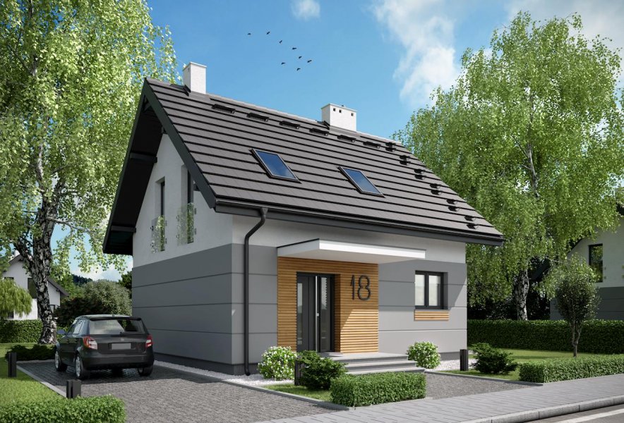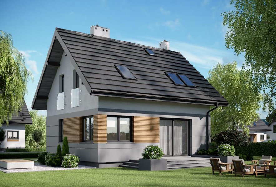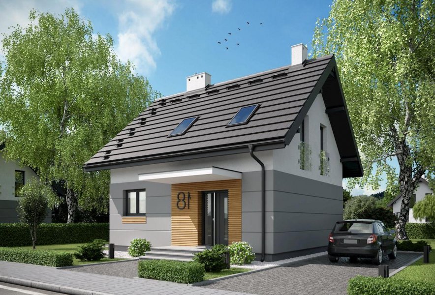Niespełna 75 m2 to, jak dotąd, najmniejsza powierzchnia, na której Archeton zaproponował projekt domu parterowego z użytkowym poddaszem. Prawie kwadratowy rzut Lizy wypełnia na parterze otwarta strefa dzienna z kominkiem, a na poddaszu trzy niewielkie ale ustawne sypialnie (można je zamienić innym układem ścian działowych na dwie większe). Na dole zmieściła się jeszcze wygodna sień z głęboką szafą, wc pod schodami i pralnia z kotłem gazowym. Miłą ekstrawagancją w domu o tak skromnych rozmiarach jest rozwiązanie strefy nocnej z dużą łazienką. Projekt domu Liza cechuje tania w budowie i w utrzymaniu, zwarta bryła. Zamiast balkonów zaproponowano eleganckie, smukłe okna balkonowe typu porte fenetre. Dwuspadowy dach ma najprostszą konstrukcję, a ponadto spore nachylenie. Razem z głębokimi okapami nad ścianami szczytowymi oraz równoległym do drogi dojazdowej ustawieniem kalenicy wydłuża to optycznie krępe, energooszczędne proporcje budynku. Prosty rysunek elewacji podkreśla płaski daszek nad wejściem, duże przeszklenie w salonie i narożne okno w jadalni.