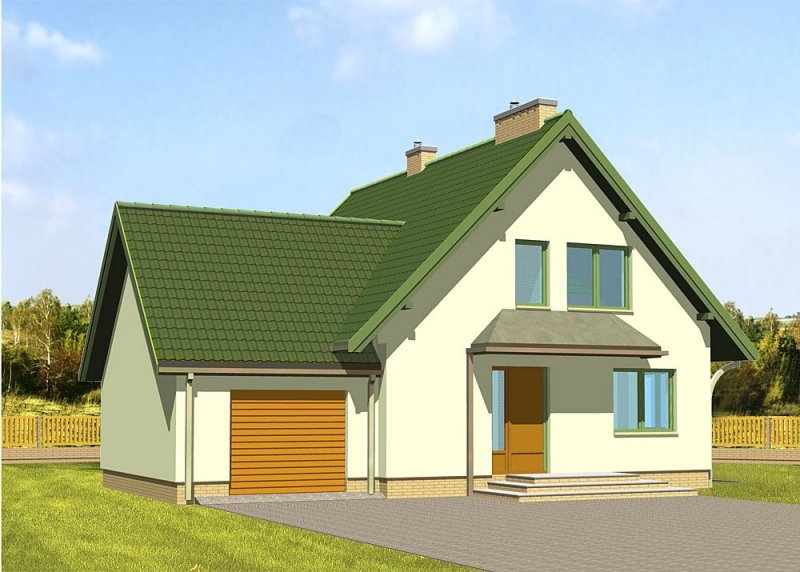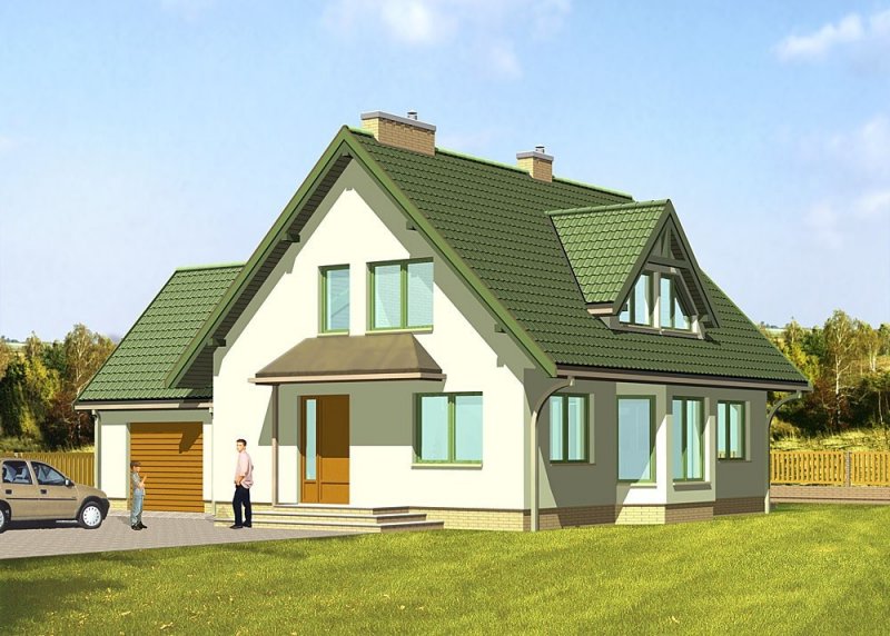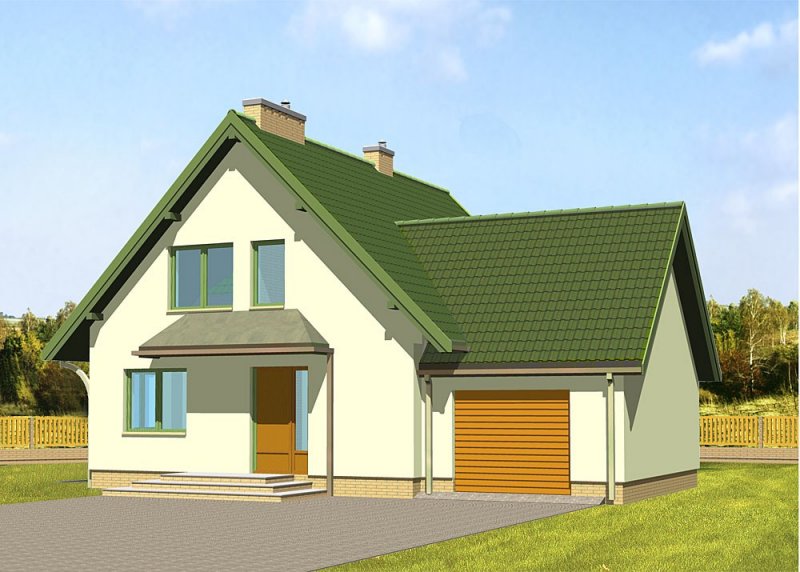 Dom jednorodzinny, parterowy, z poddaszem użytkowym i jednostanowiskowym garażem, częściowo podpiwniczony.