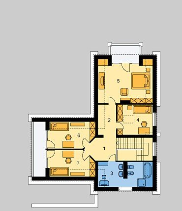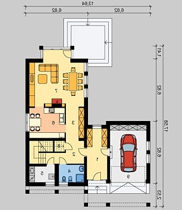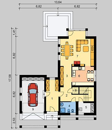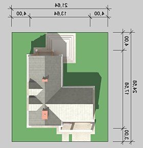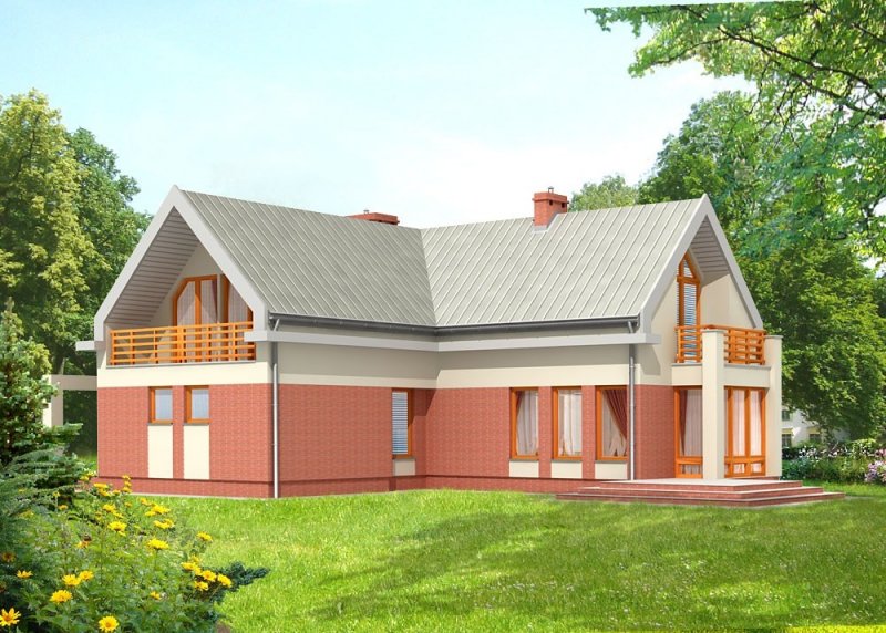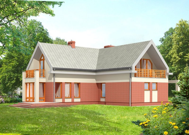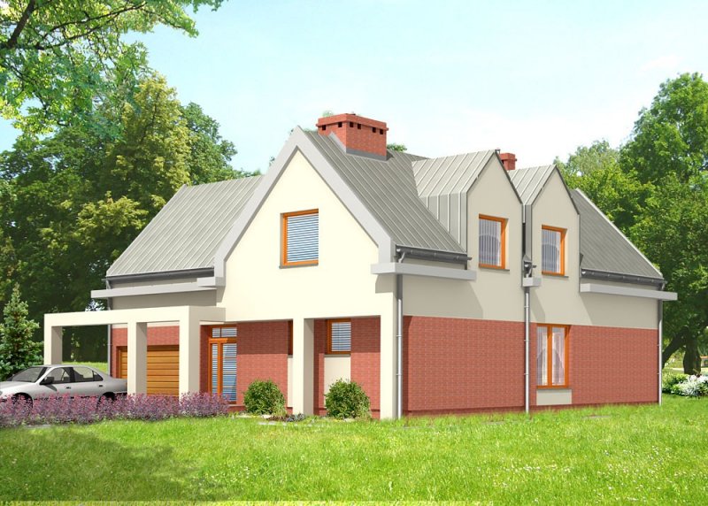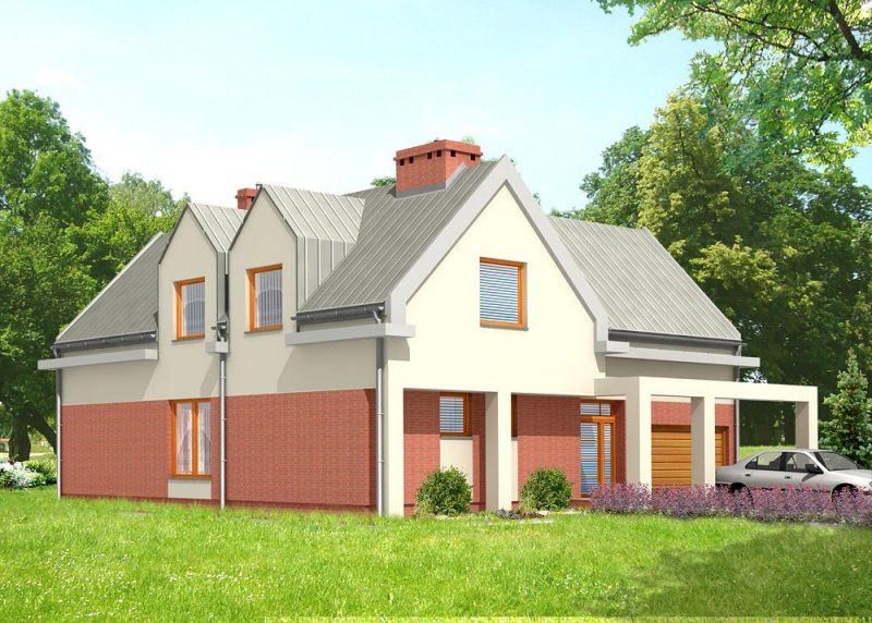 Dom jednorodzinny, parterowy, z poddaszem użytkowym i jednostanowiskowym garażem.