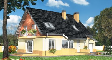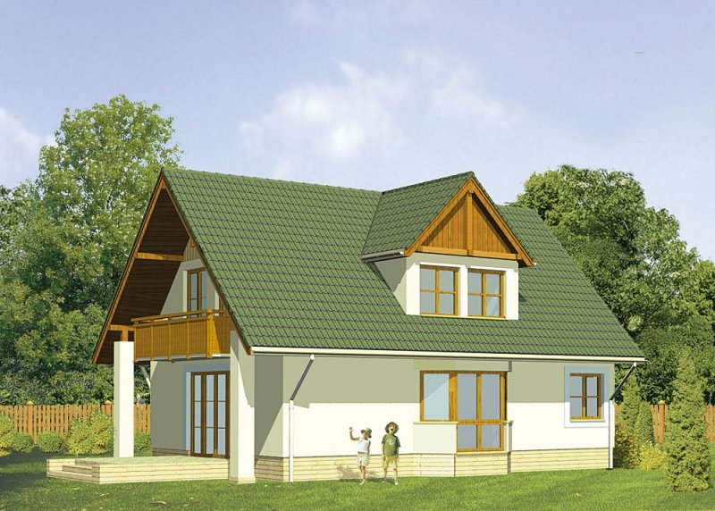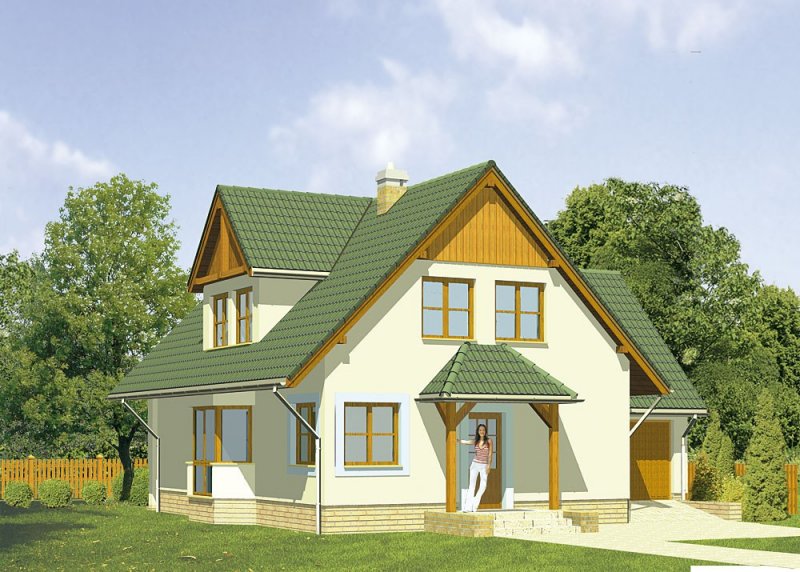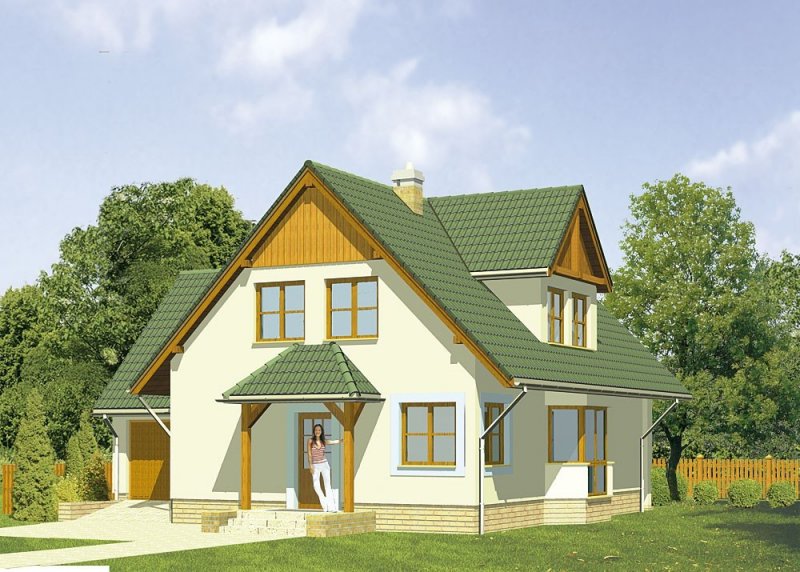 Dom jednorodzinny, parterowy, z poddaszem użytkowym i jednostanowiskowym garażem.