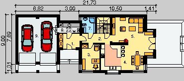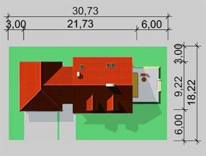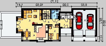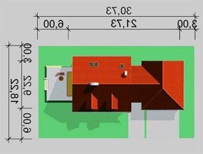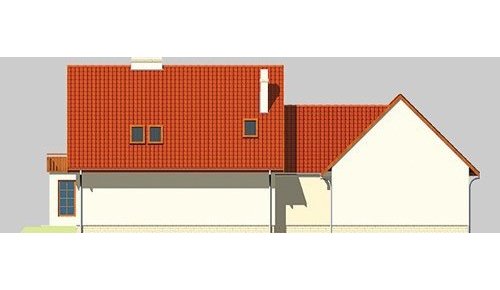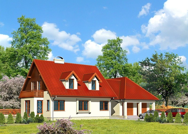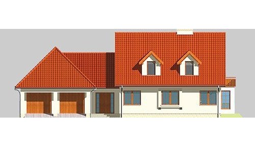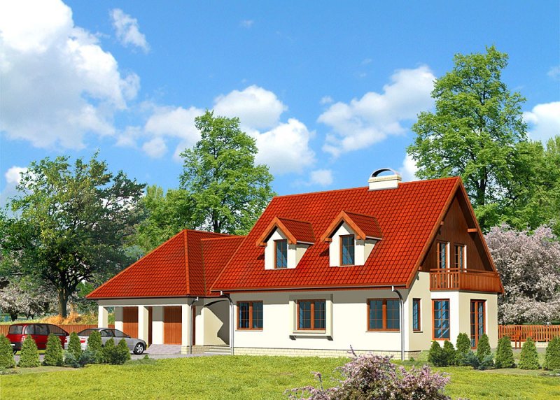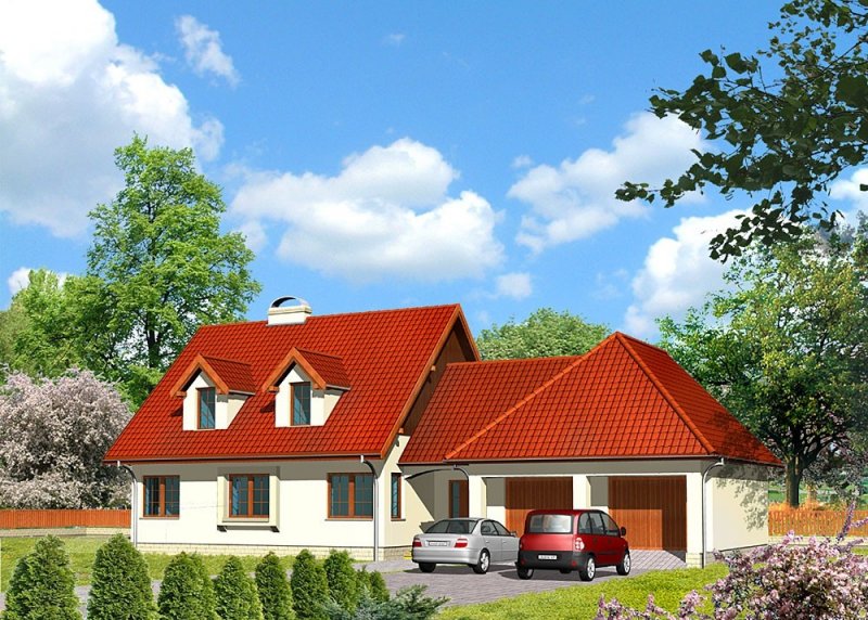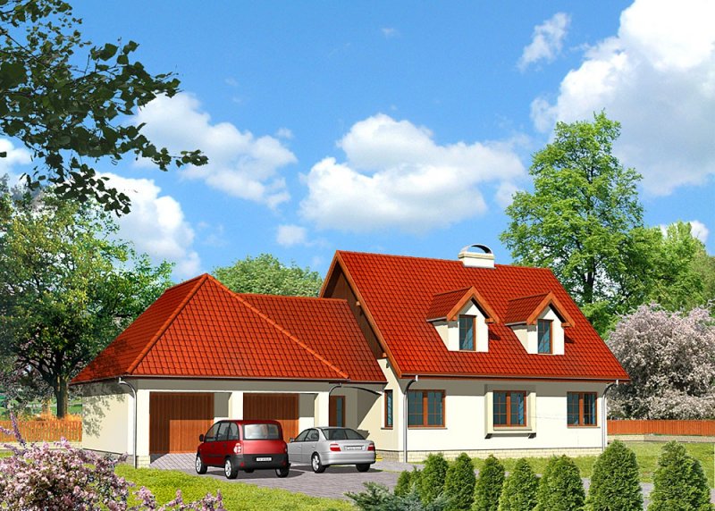 Dom jednorodzinny, parterowy, z poddaszem użytkowym i dwustanowiskowym garażem.