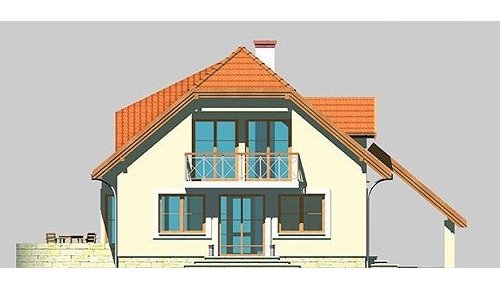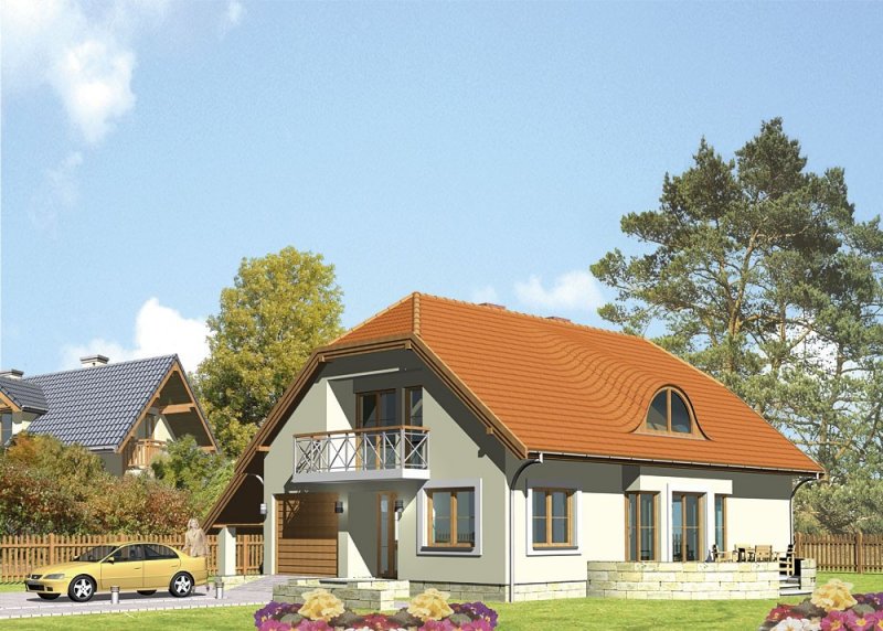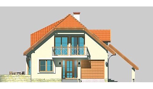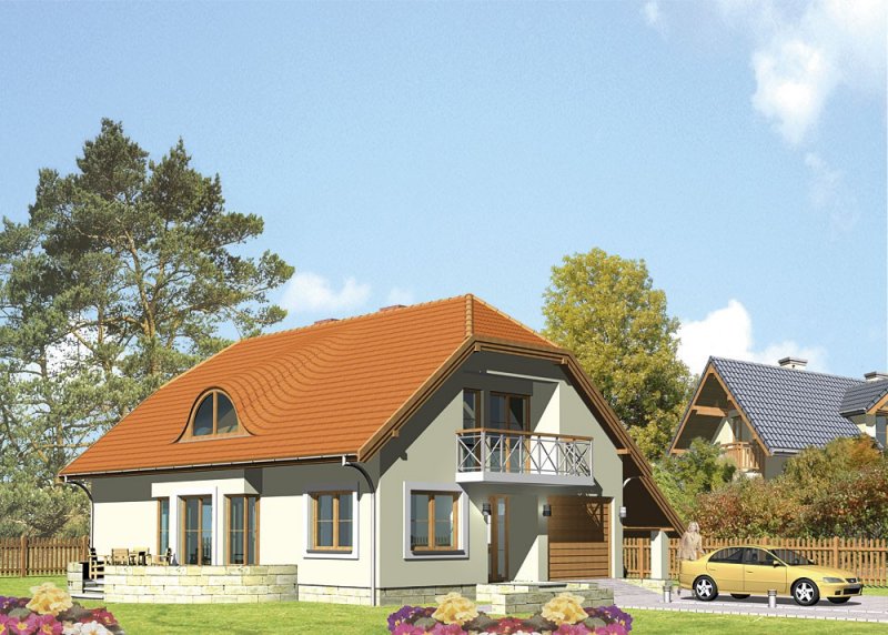 Dom jednorodzinny, parterowy, z poddaszem użytkowym o jednostanowiskowym garażem.
