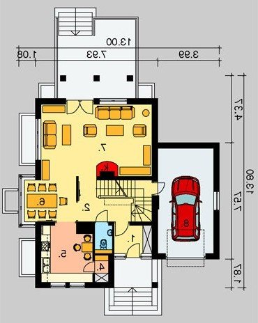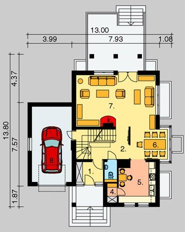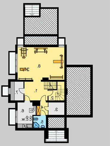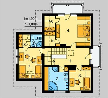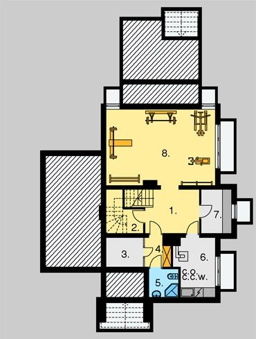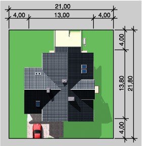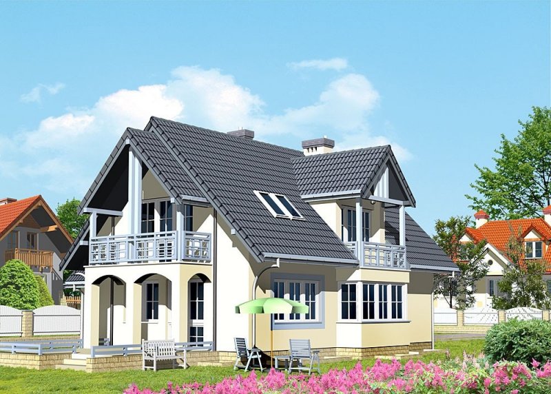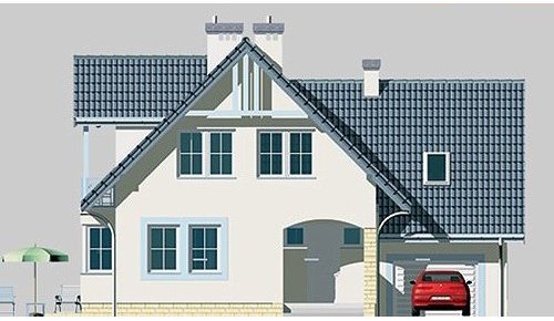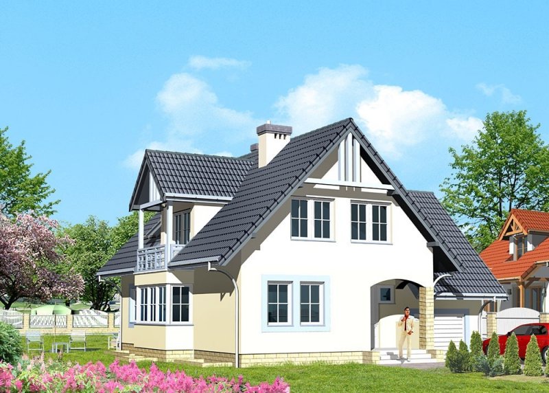 Dom jednorodzinny, parterowy, z poddaszem użytkowym i jednostanowiskowym garażem, podpiwniczony.