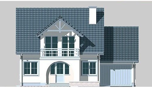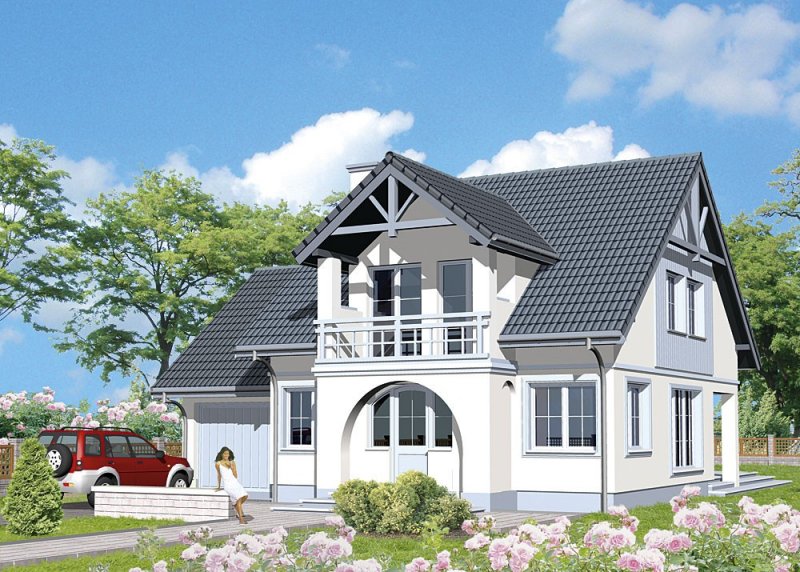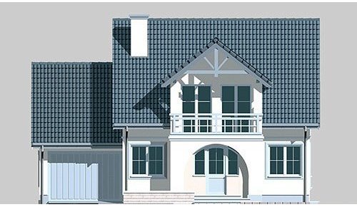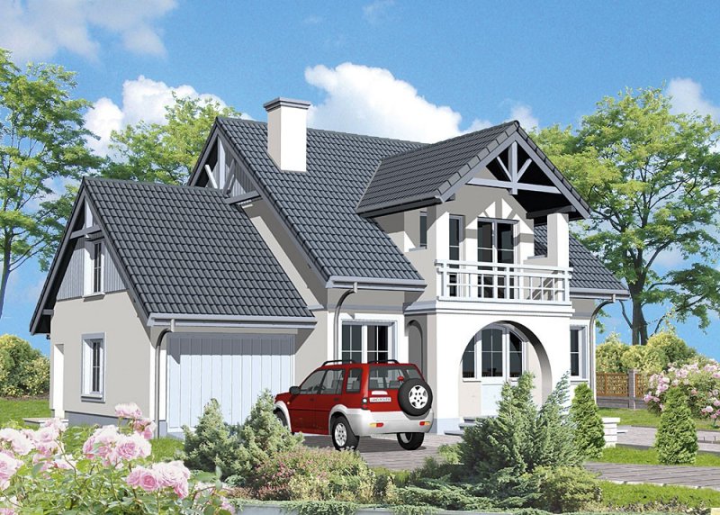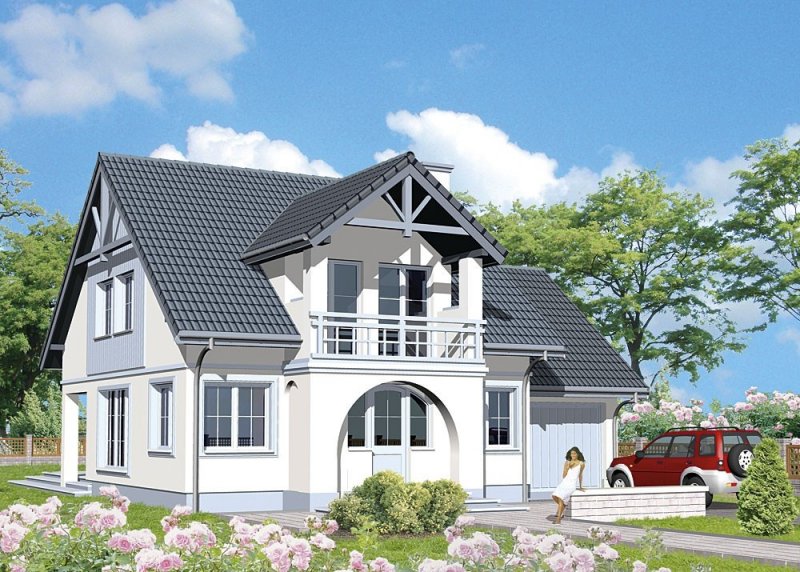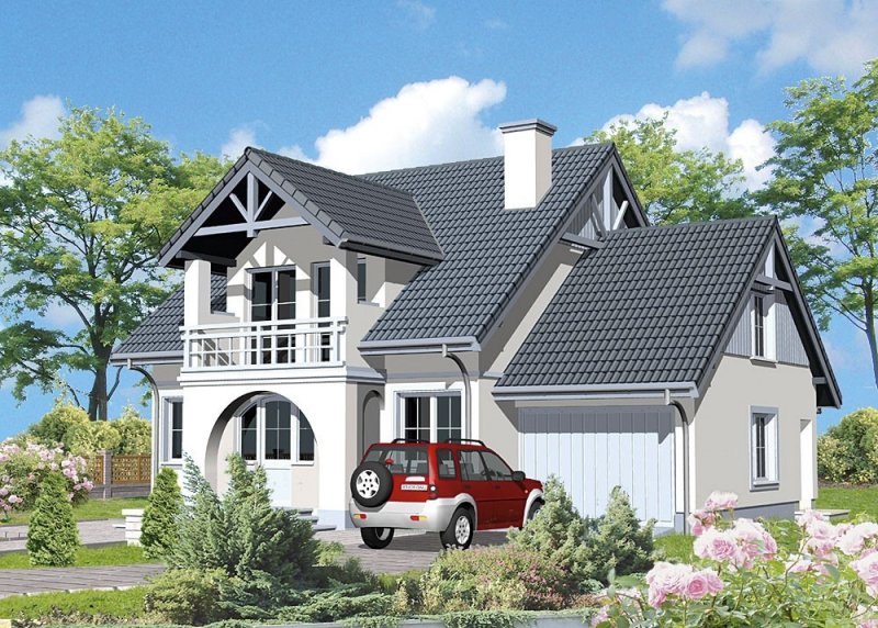 Dom jednorodzinny, parterowy, z poddaszem użytkowym i jednostanowiskowym garażem.