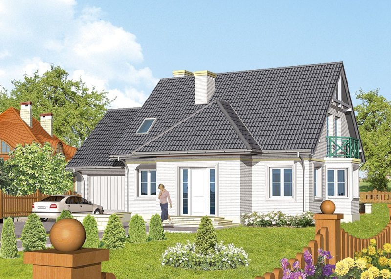 Dom jednorodzinny, parterowy, z poddaszem użytkowym i jednostanowiskowym garażem.