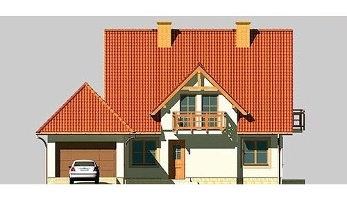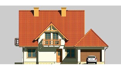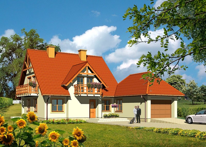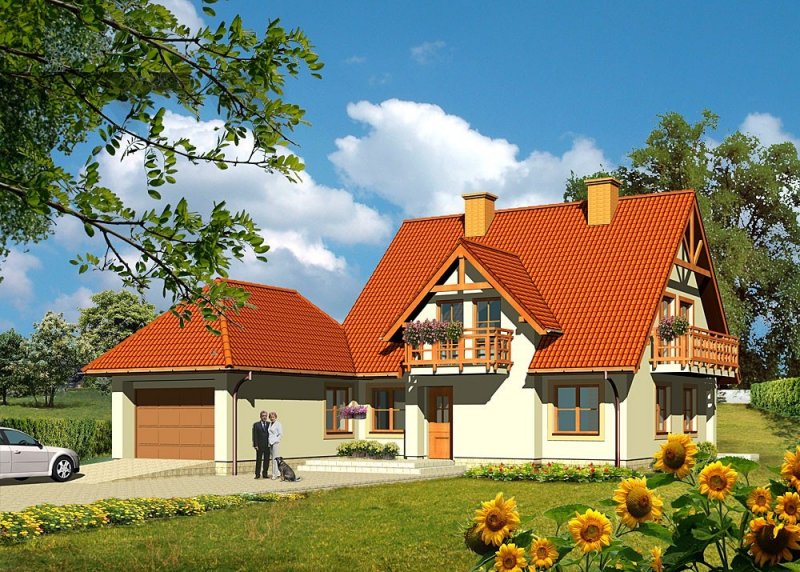Dom jednorodzinny, parterowy, z poddaszem użytkowym i dwustanowiskowym garażem.
