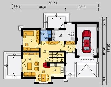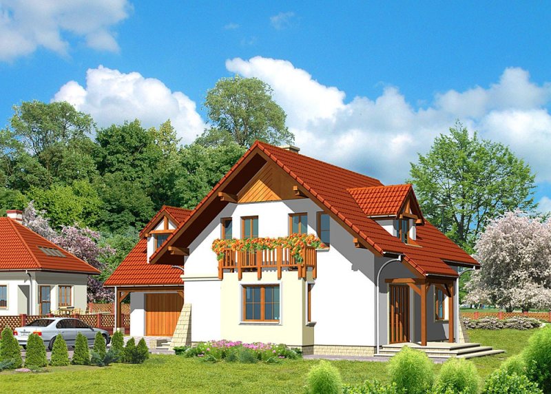 Dom jednorodzinny, parterowy, z poddaszem użytkowym i jednostanowiskowym garażem.