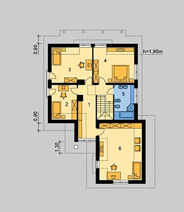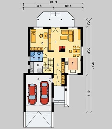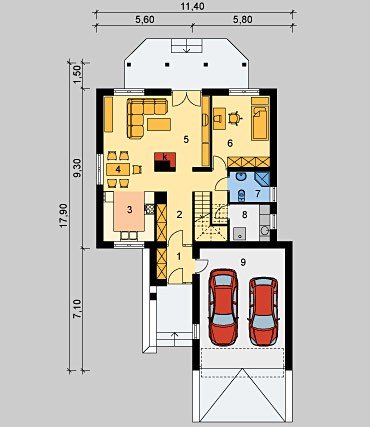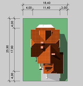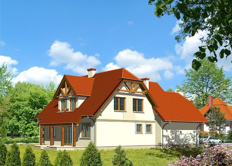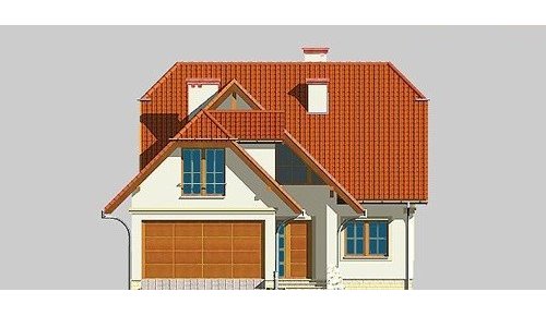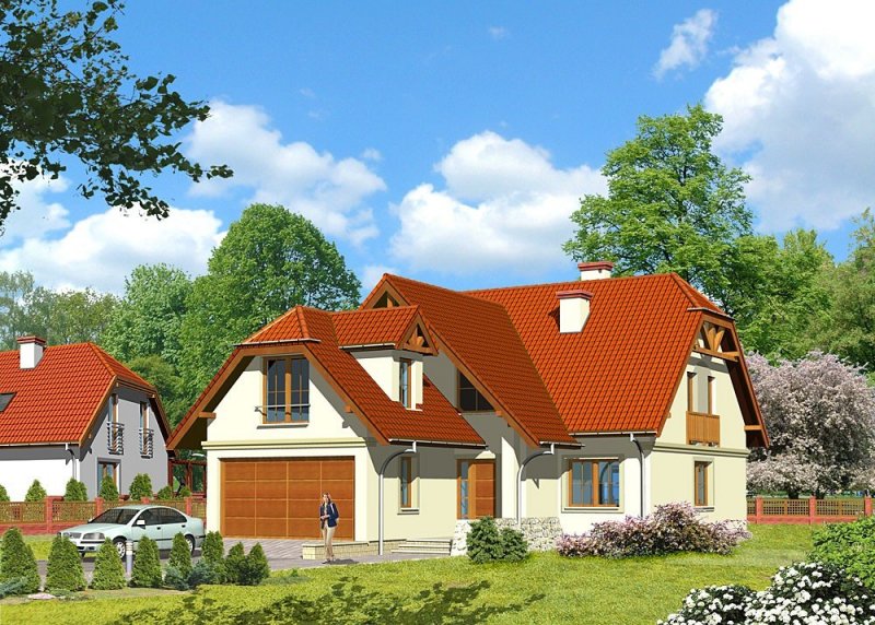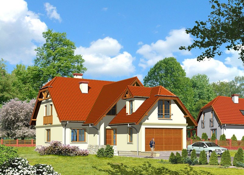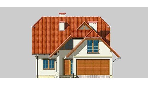 Dom jednorodzinny, parterowy, z poddaszem użytkowym i dwustanowiskowym garażem.