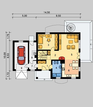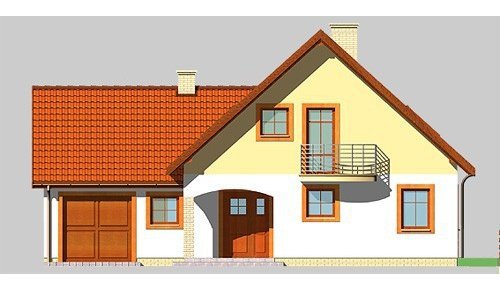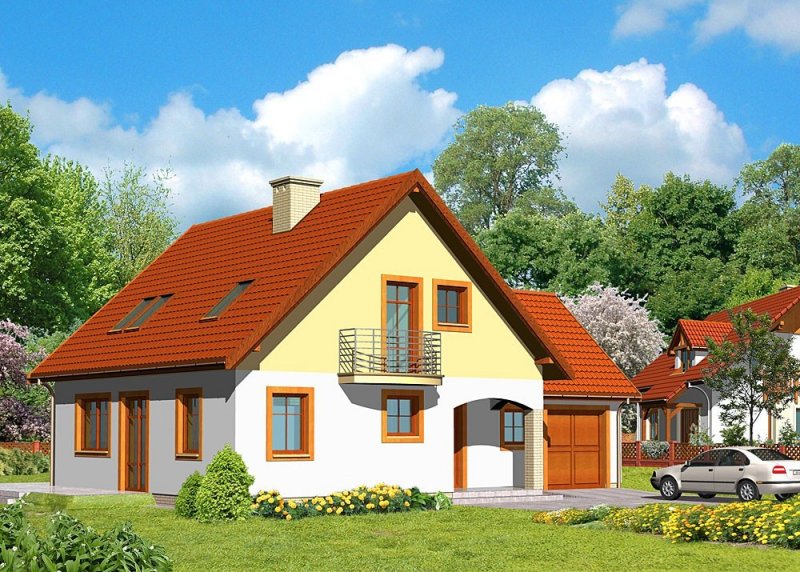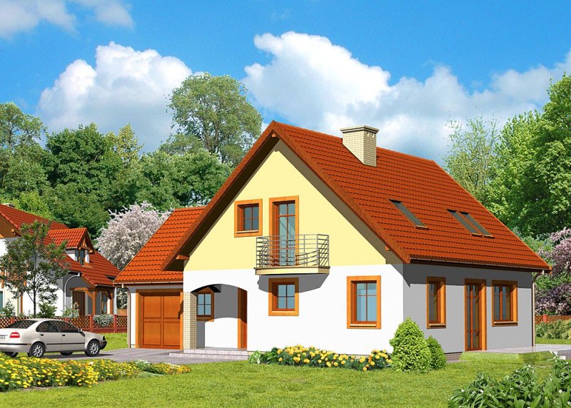 Dom jednorodzinny, parterowy, z poddaszem użytkowym i jednostanowiskowym garażem.