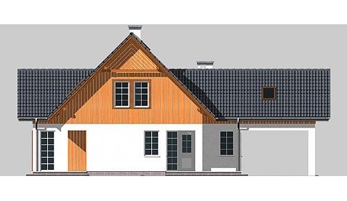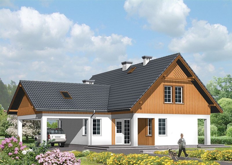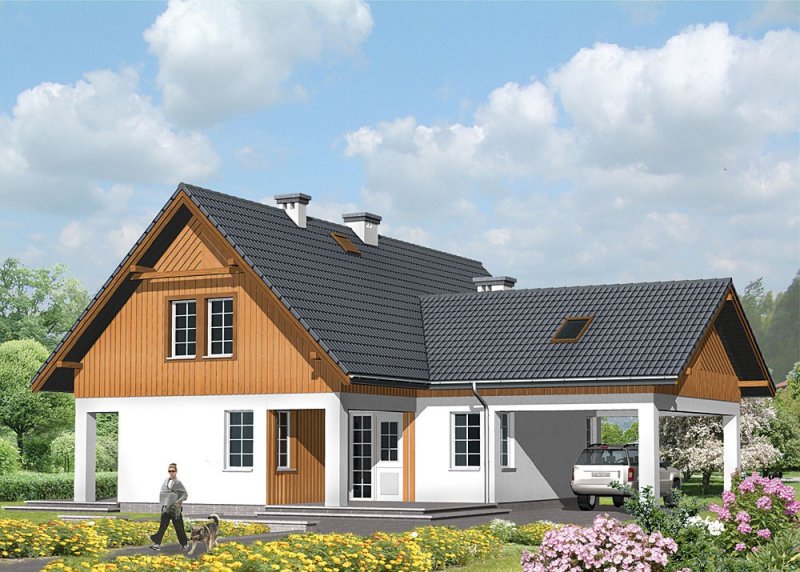 Dom jednorodzinny, parterowy, z poddaszem użytkowym i wiatą garażową.