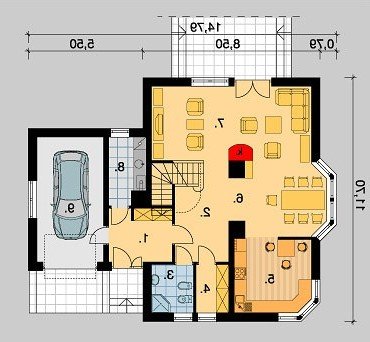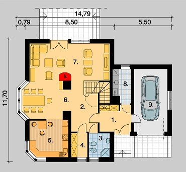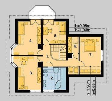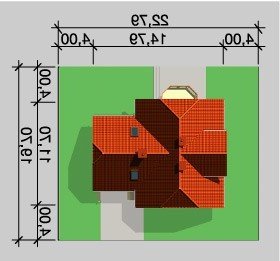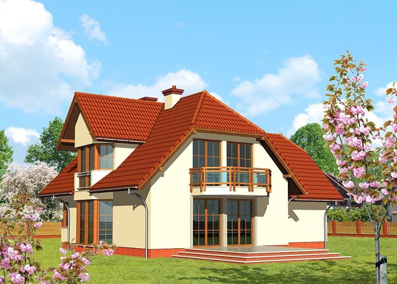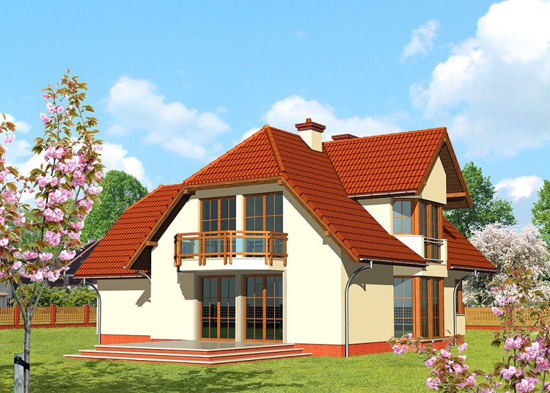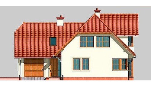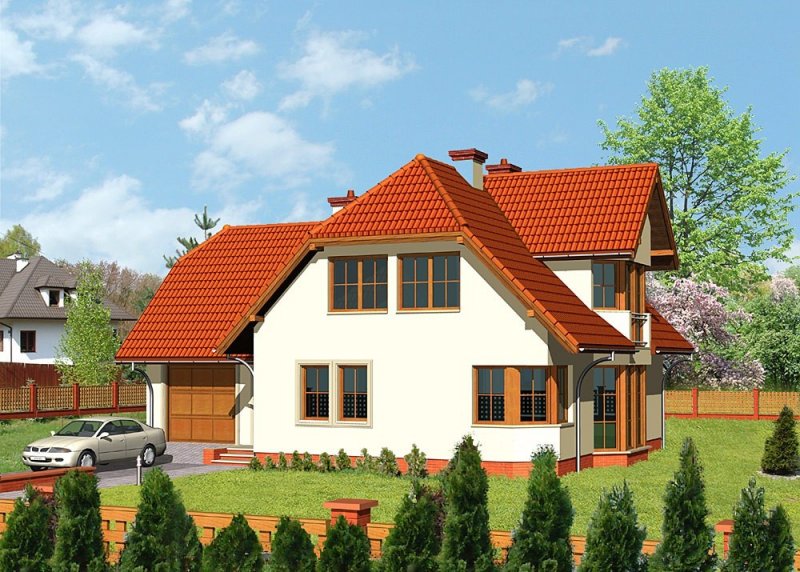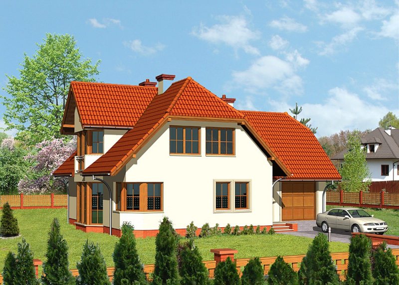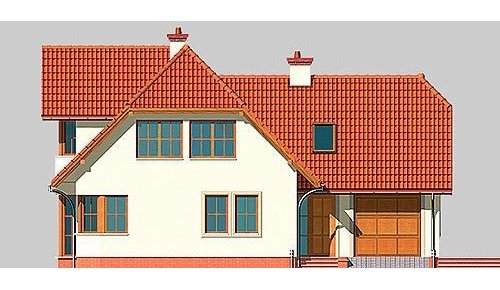 Dom jednorodzinny, parterowy, z poddaszem użytkowym i jednostanowiskowym garażem.