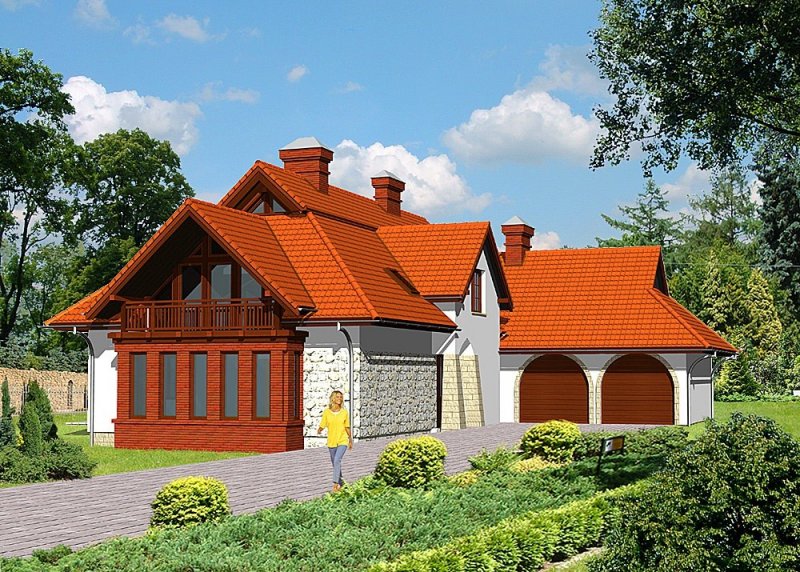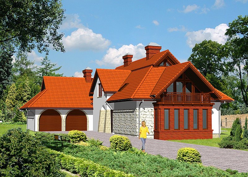 Dom jednorodzinny, parterowy, z poddaszem użytkowym i dwustanowiskowym garażem.