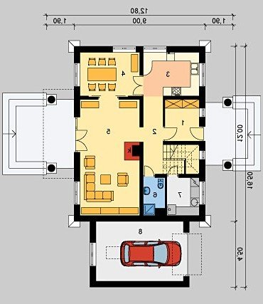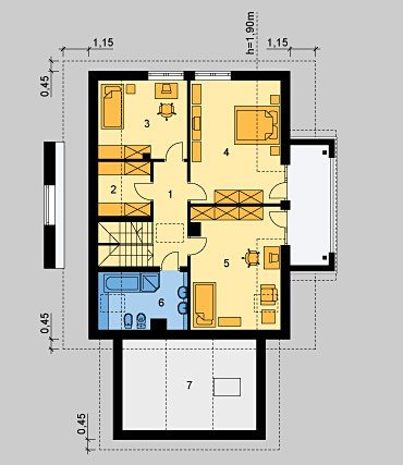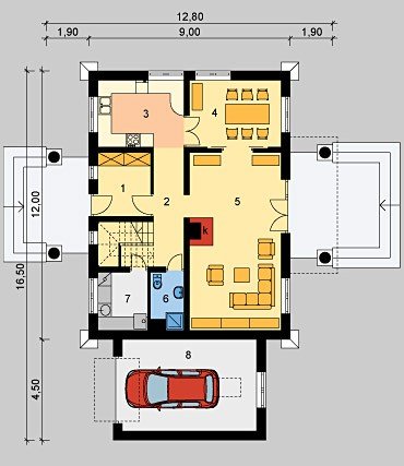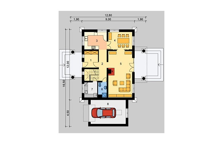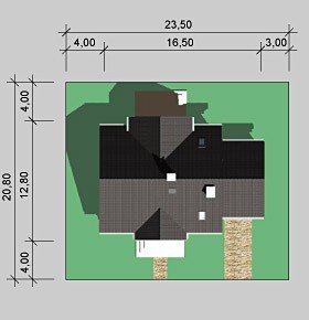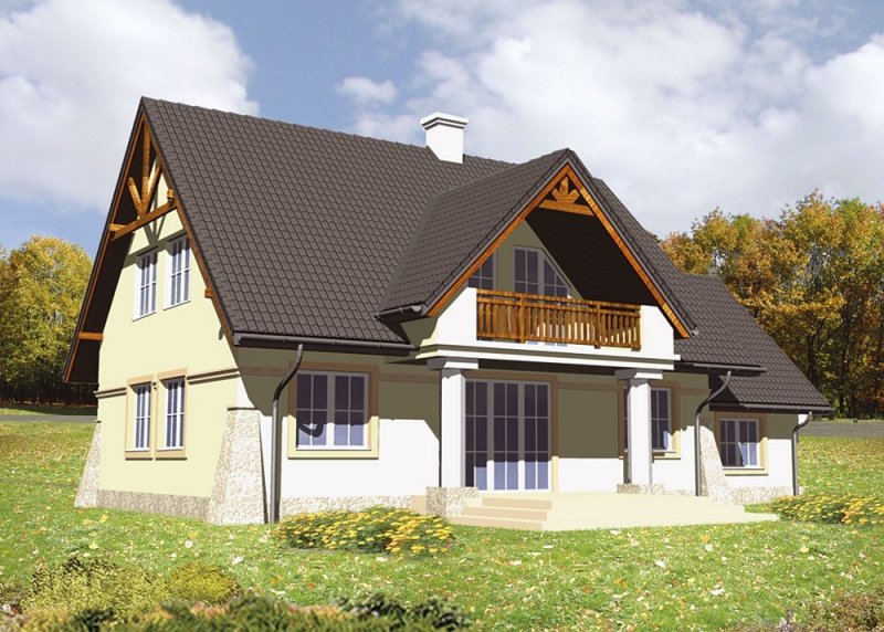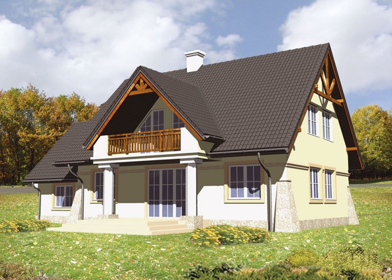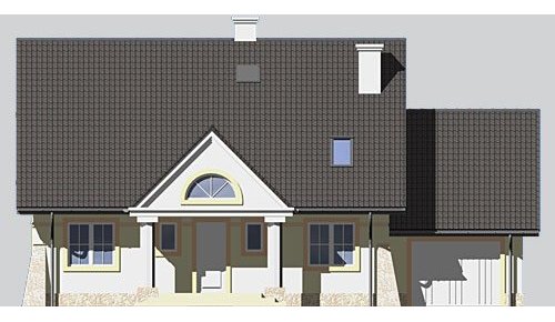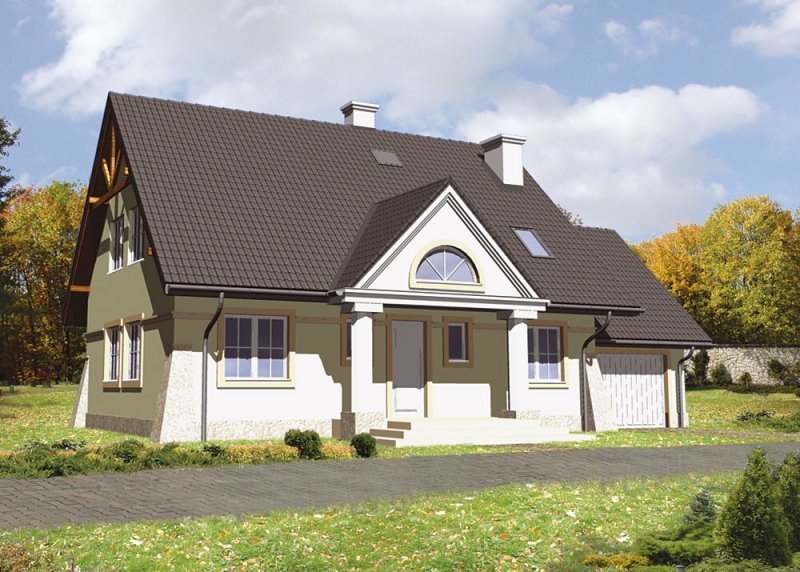 Dom jednorodzinny, parterowy, z poddaszem użytkowym i jednostanowiskowym garażem.