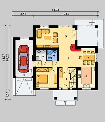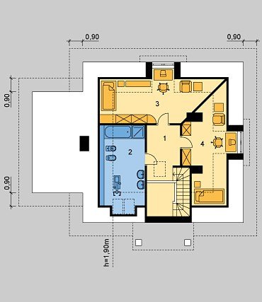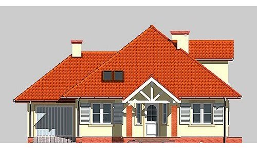 Dom jednorodzinny, parterowy, z poddaszem użytkowym i jednostanowiskowym garażem.