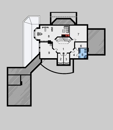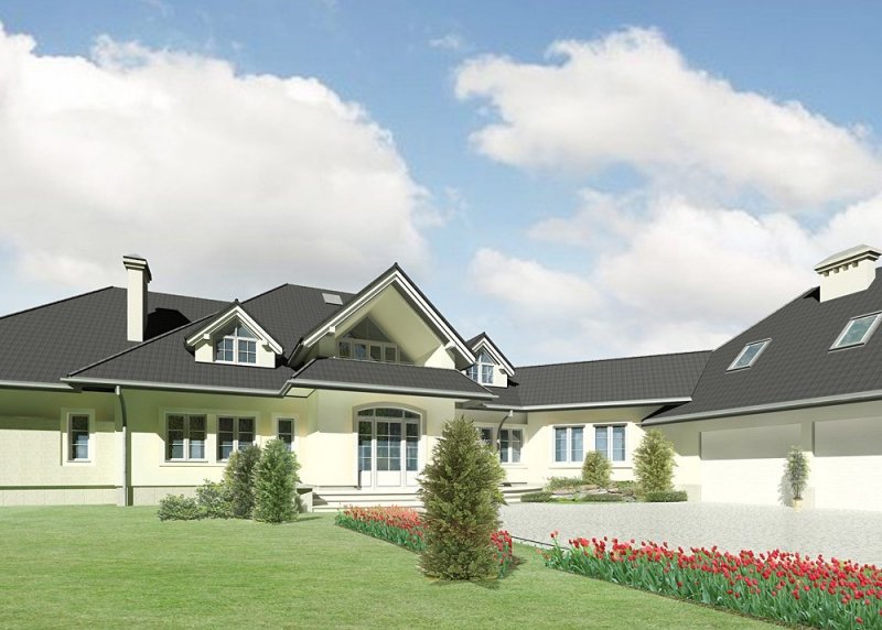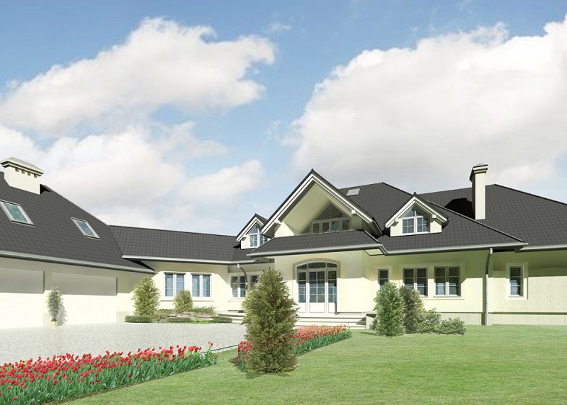 Dom jednorodzinny, parterowy, z poddaszem użytkowym, częściowym podpiwniczeniem i dwustanowiskowym garażem.