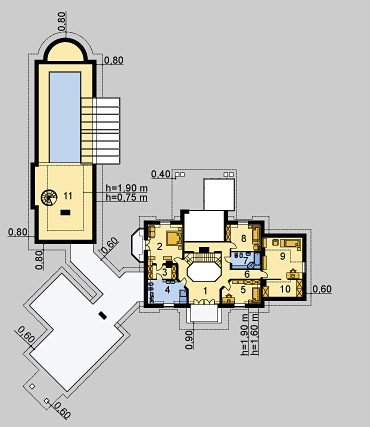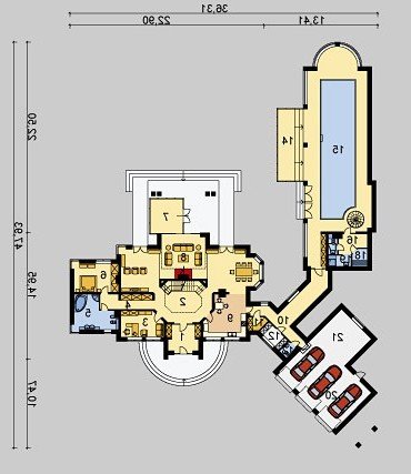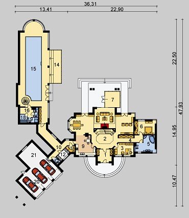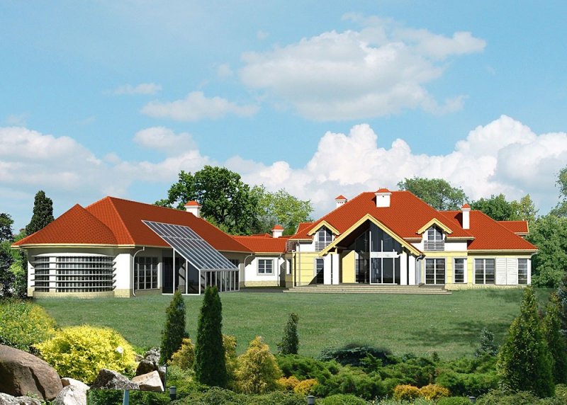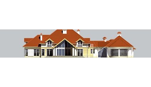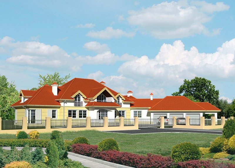 Dom jednorodzinny, parterowy, z poddaszem użytkowym, z krytym basenem i trzystanowiskowym garażem.