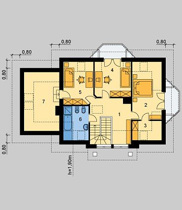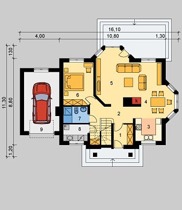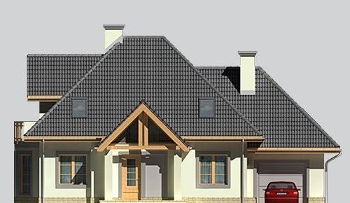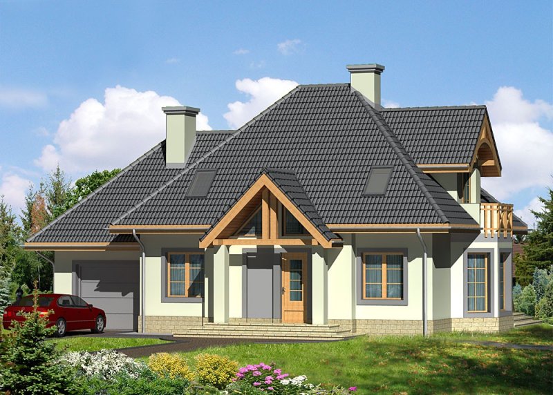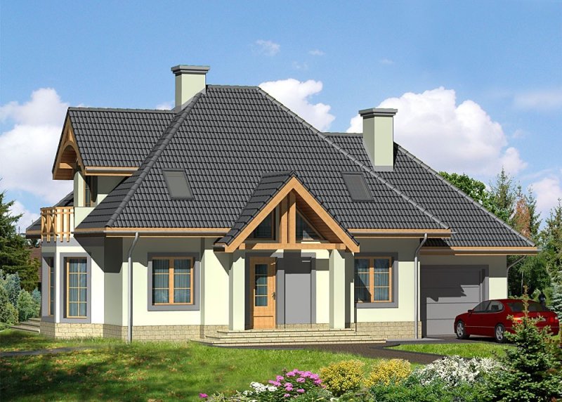 Dom jednorodzinny parterowy, z użytkowym poddaszem i jednostanowiskowym garażem.