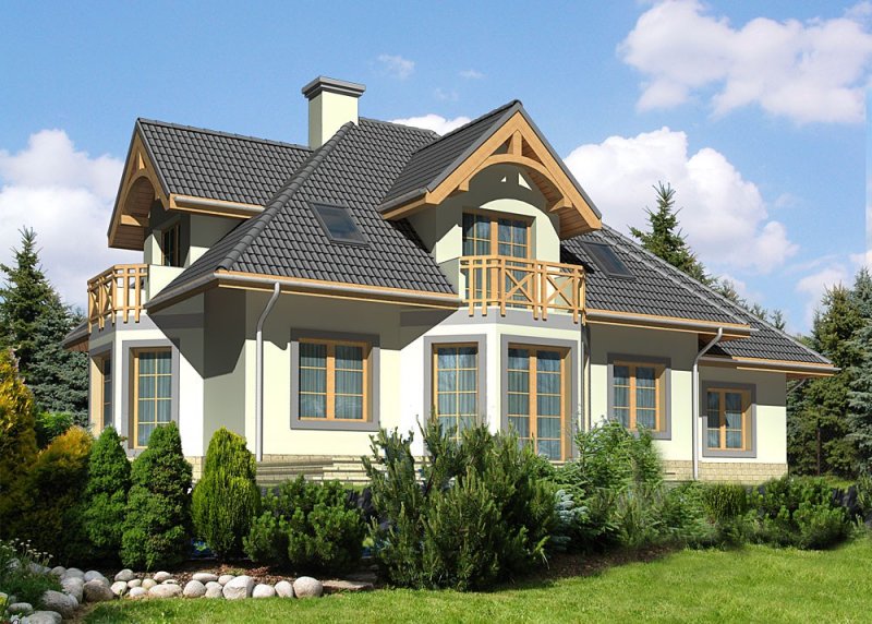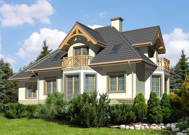 - Elewacje: wykończone tynkiem silikonowym, cokoły obłożone kamieniem naturalnym