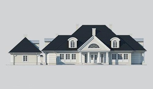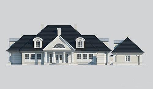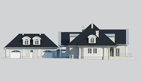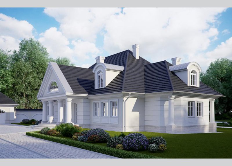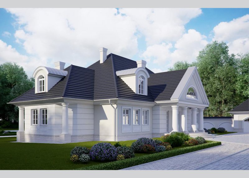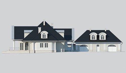 Dom jednorodzinny, parterowy, z poddaszem użytkowym oraz wolnostojącym budynkiem gospodarczym.