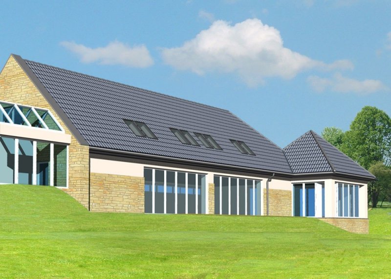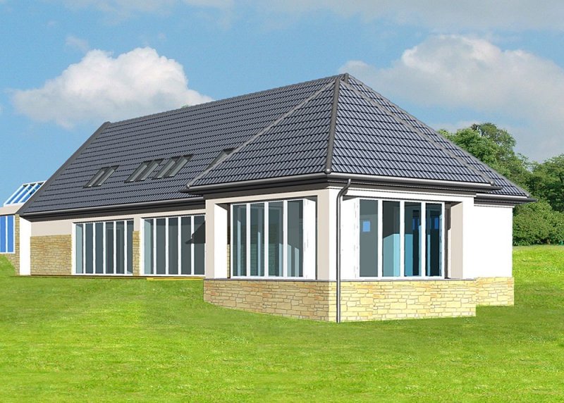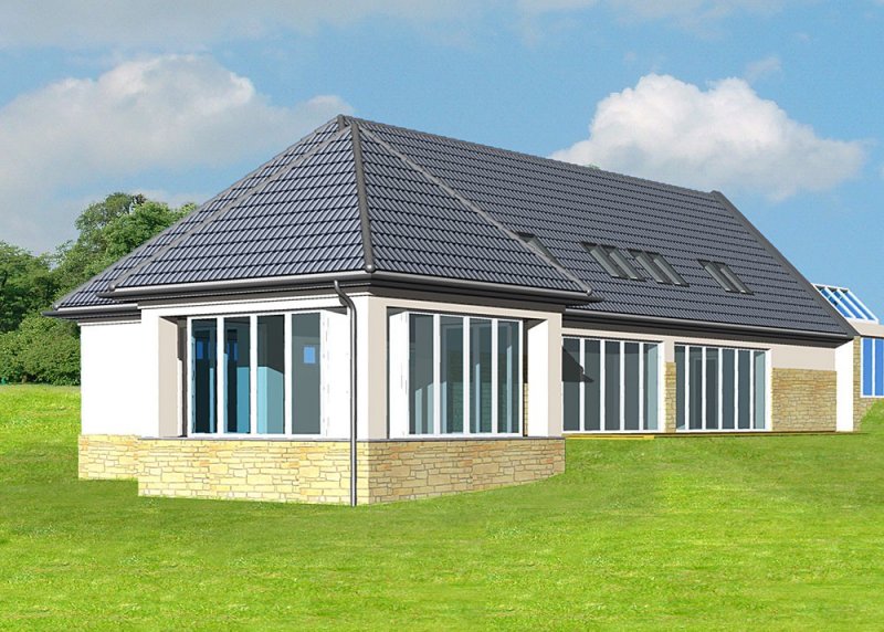 - Elewacje: wykończone tynkiem mineralnym, oraz kamieniem naturalnym łamanym