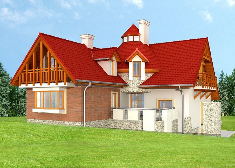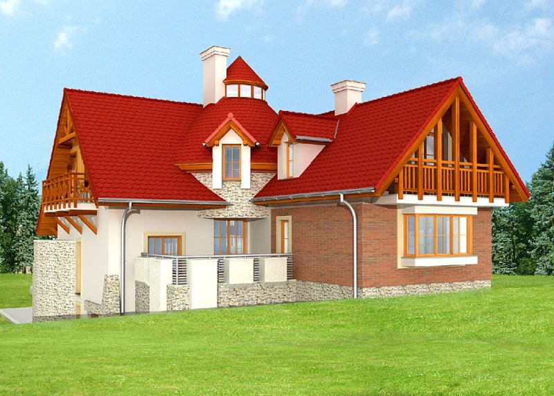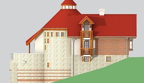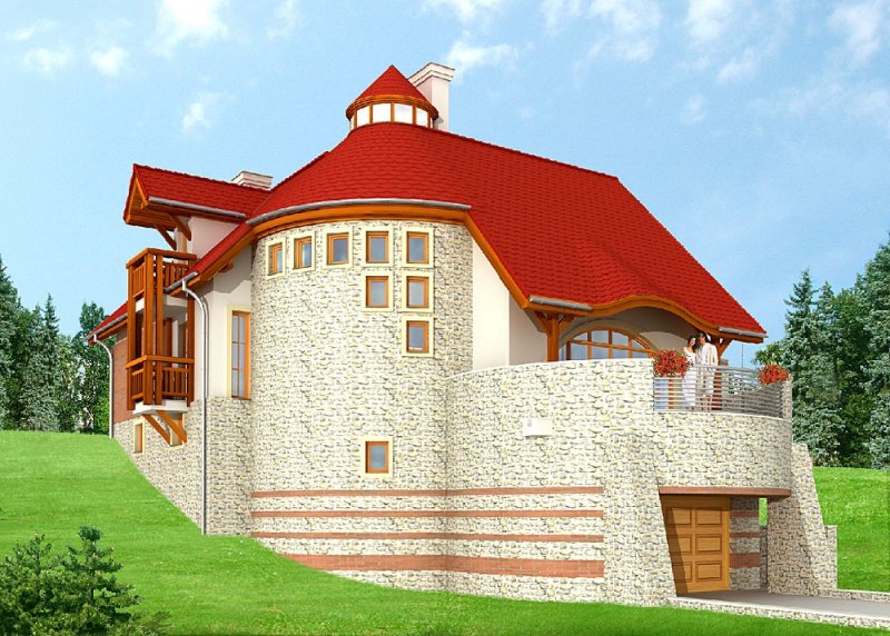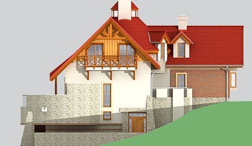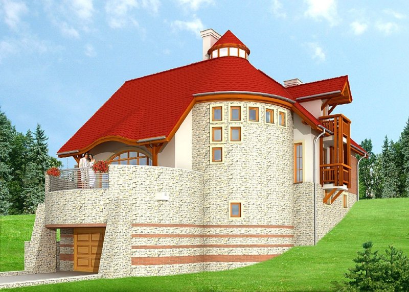 - Elewacje: wykończone tynkiem silikonowym, cokoły obłożone kamieniem naturalnym łupanym