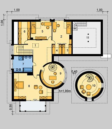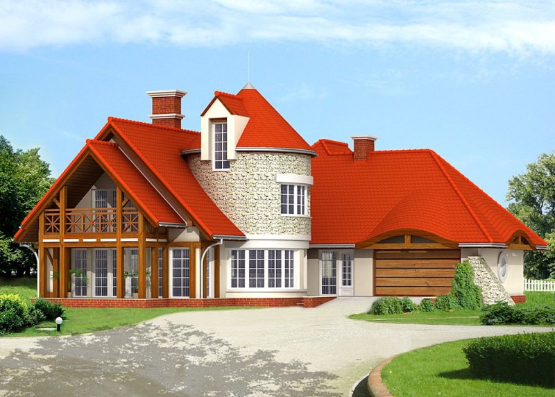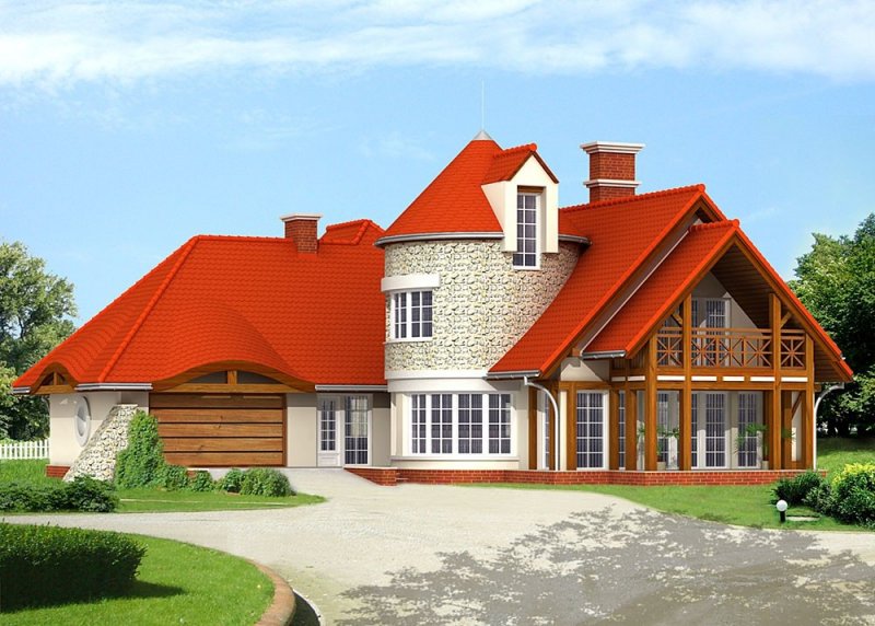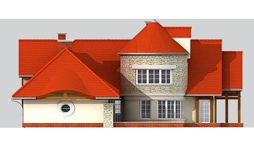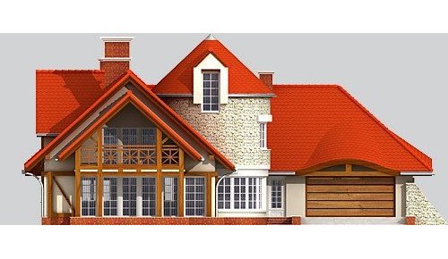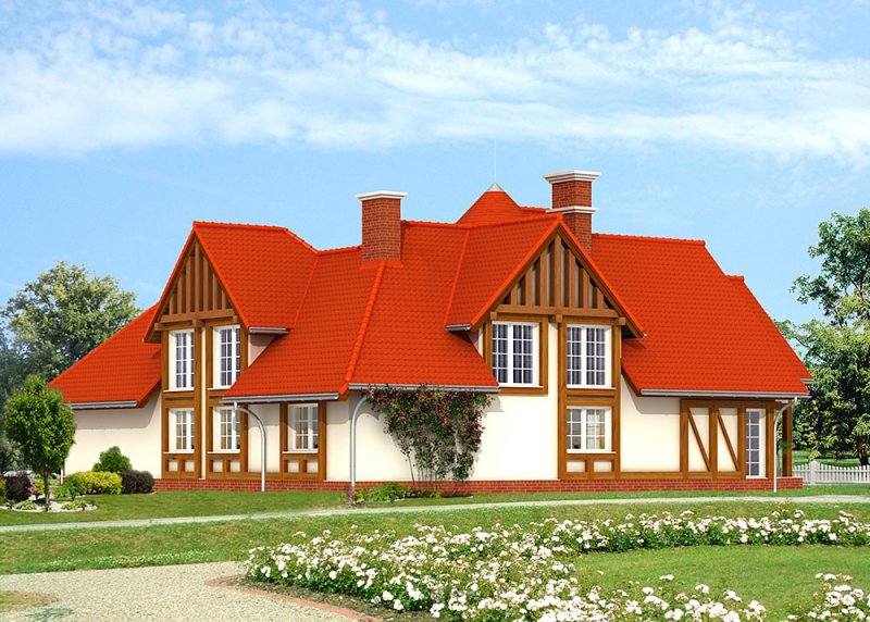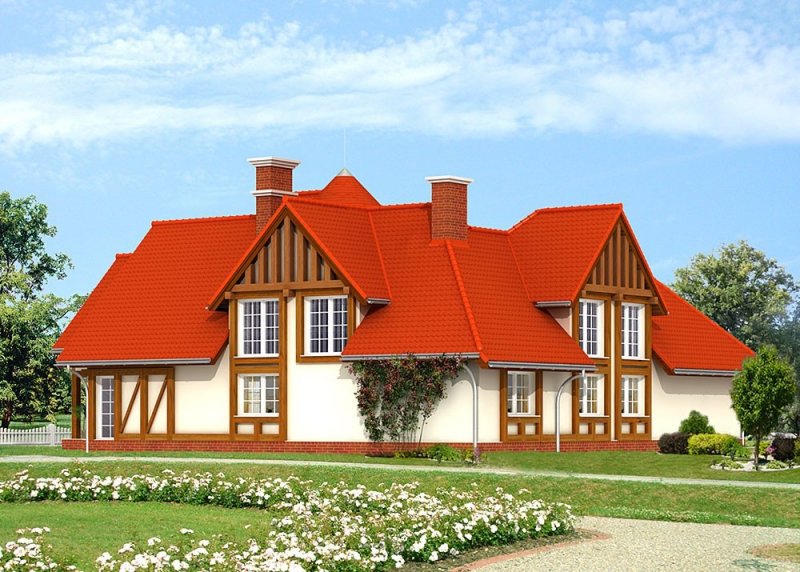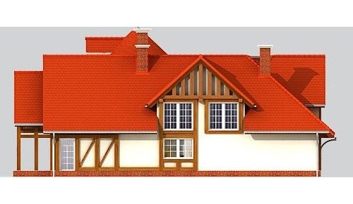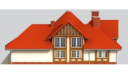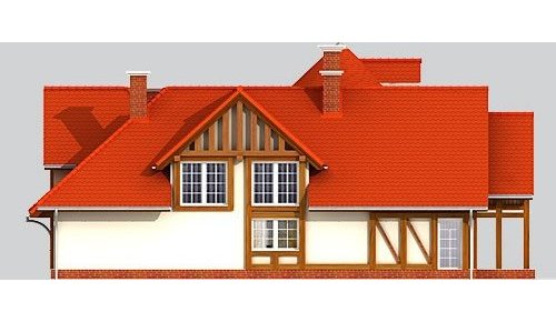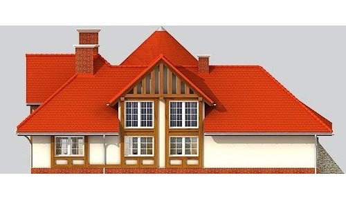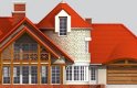 - Elewacje: wykończone tynkiem silikonowym, kamieniem elewacyjnym i ozdobami z belek drewnianych, cokół obłożony cegłą klinkierową
