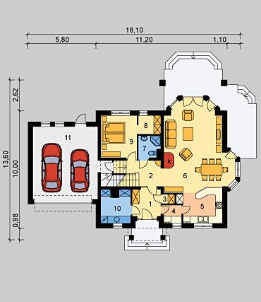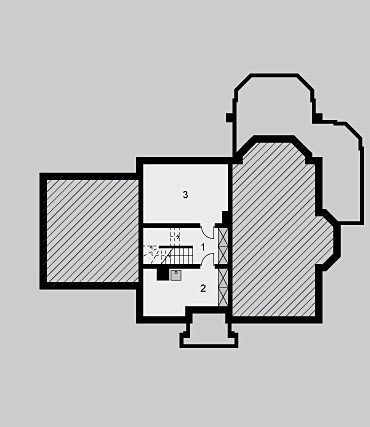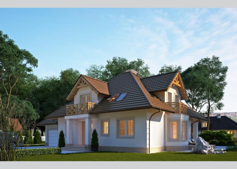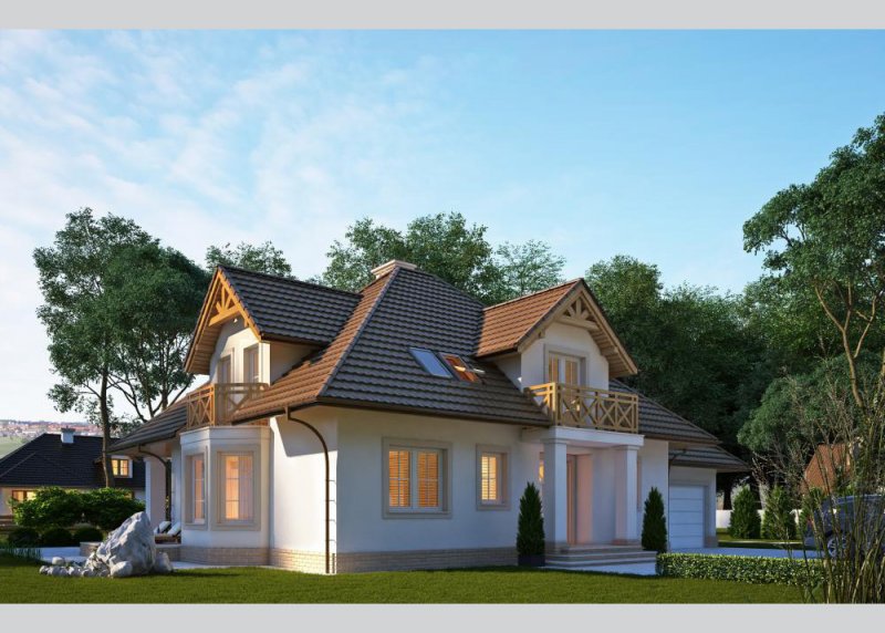 Dom jednorodzinny, parterowy z poddaszem użytkowym i jednostanowiskowym garażem, częściowo podpiwniczony.