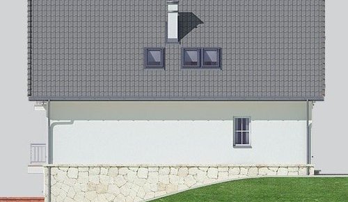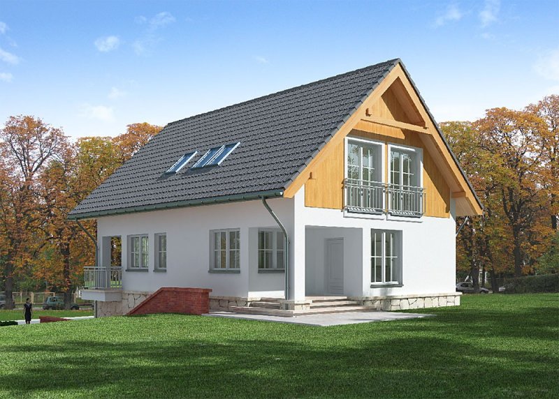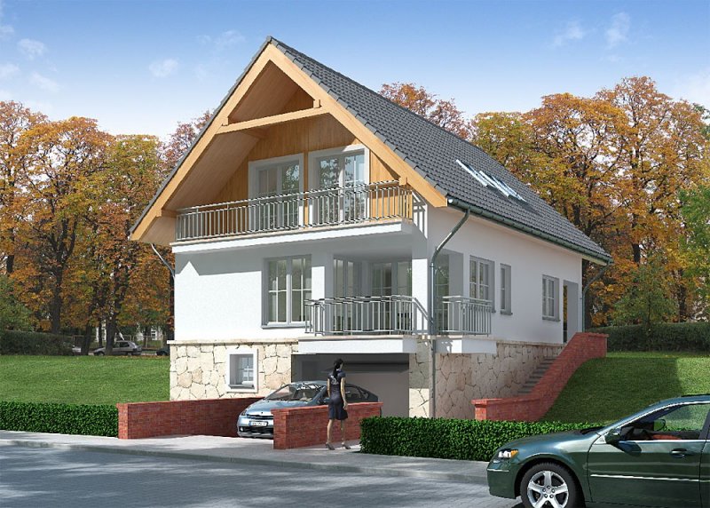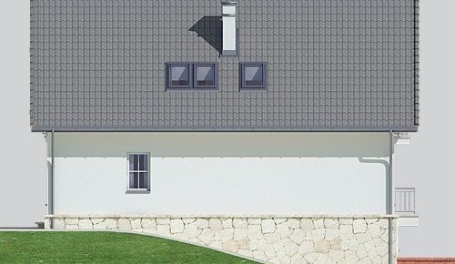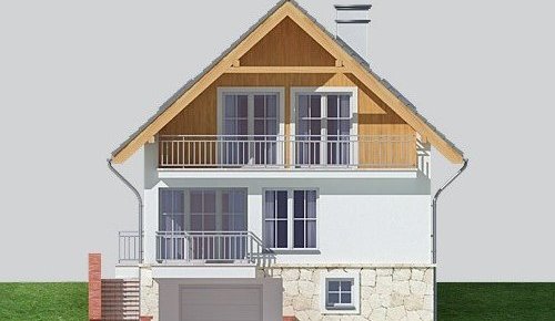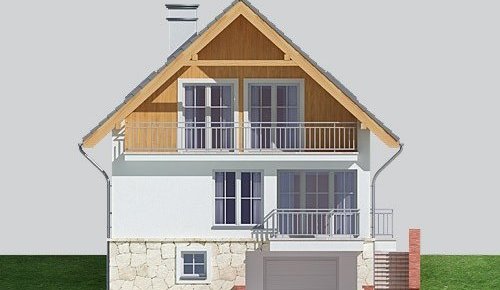 Dom jednorodzinny, parterowy z poddaszem użytkowym i jednostanowiskowym garażem, podpiwniczony.