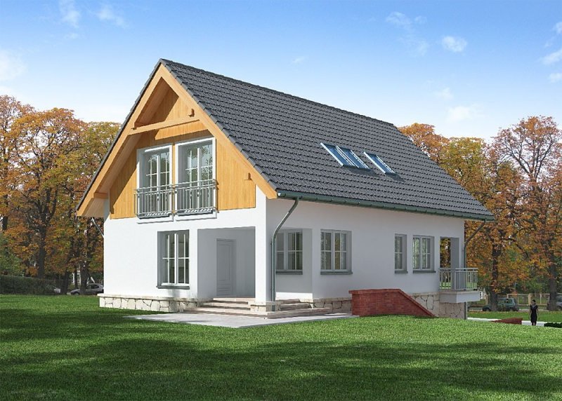 - Elewacje: wykończone tynkiem silikonowym, częściowo obłożone drewnem i kamieniem naturalnym