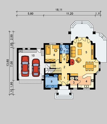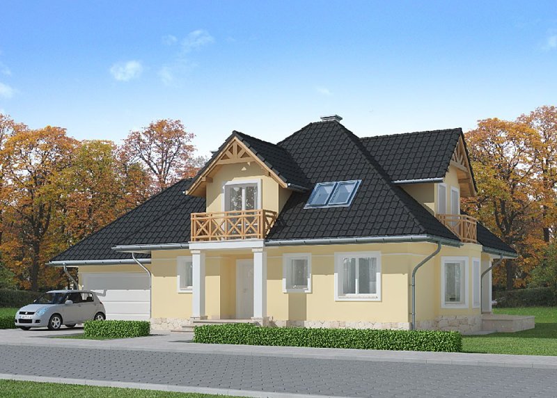 Dom jednorodzinny, parterowy z poddaszem użytkowym i dwustanowiskowym garażem, częściowo podpiwniczony.