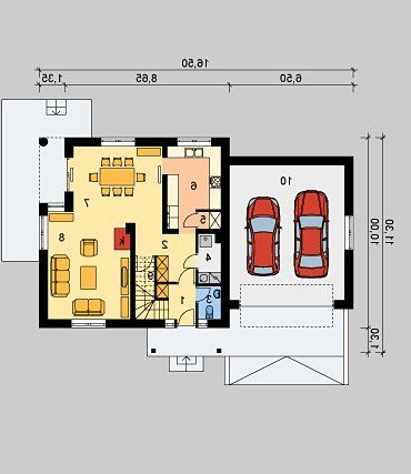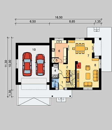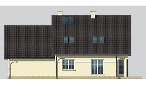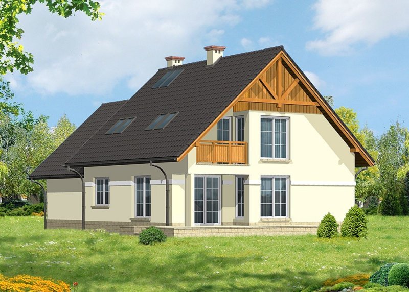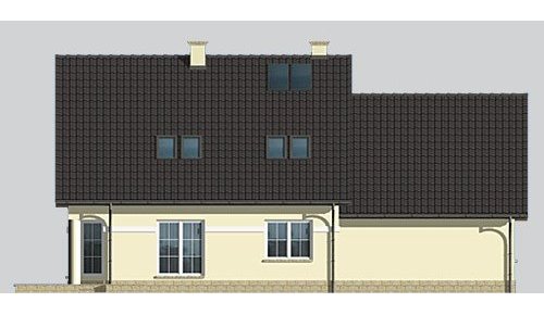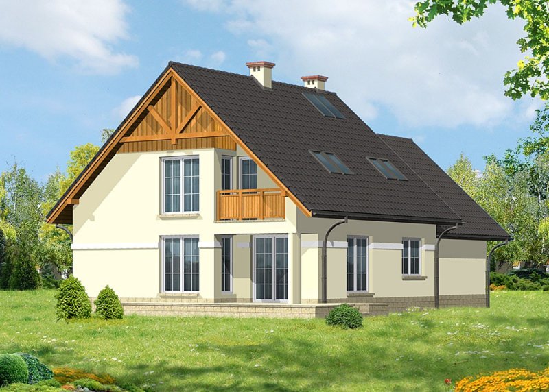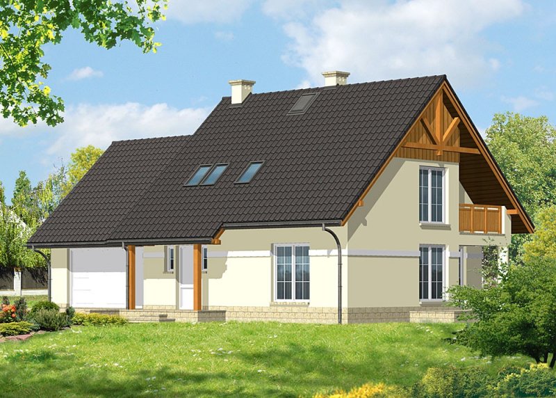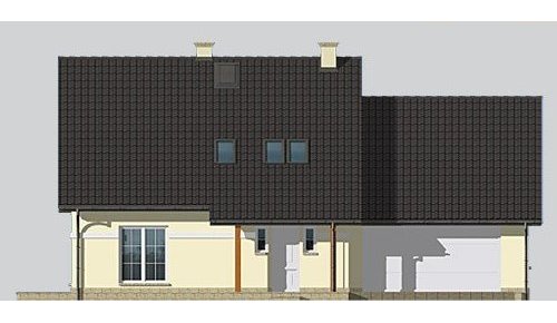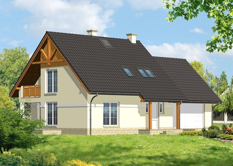 Dom jednorodzinny, niepodpiwniczony, z poddaszem użytkowym i dwustanowiskowym garażem.