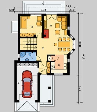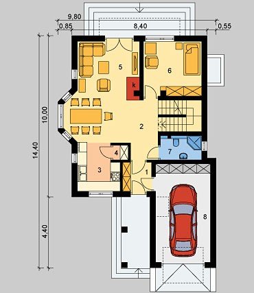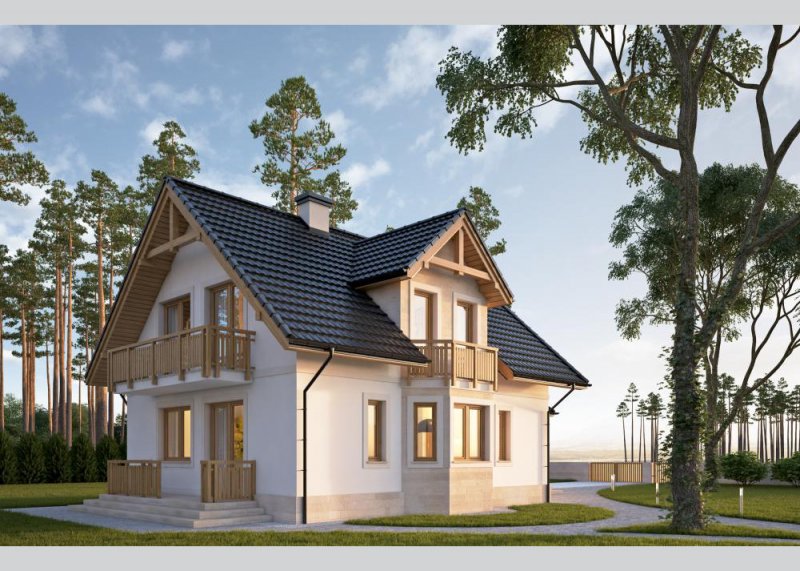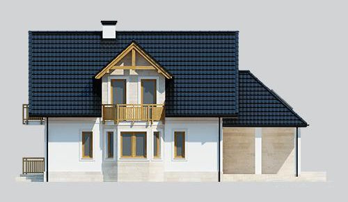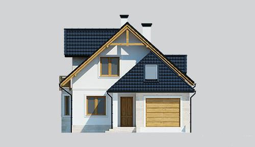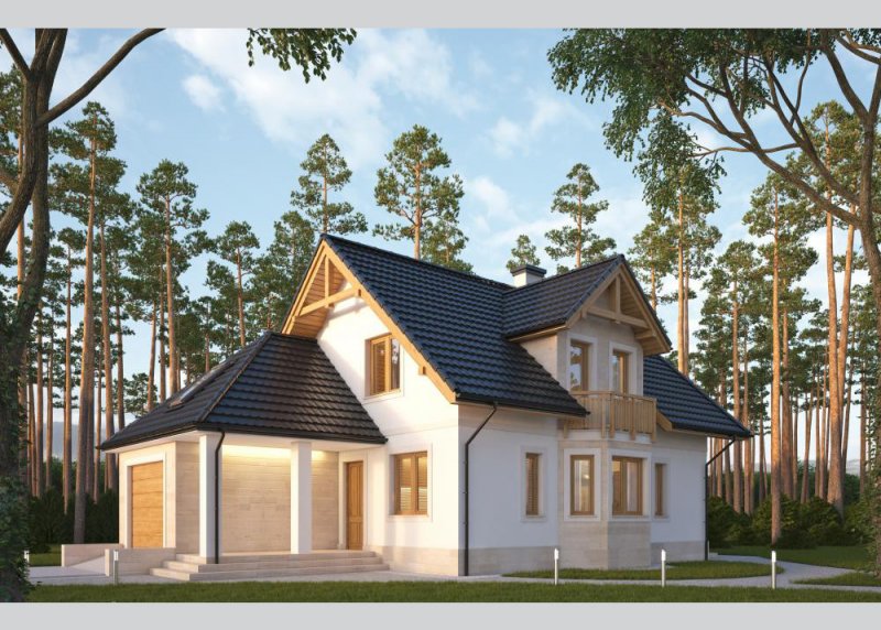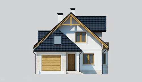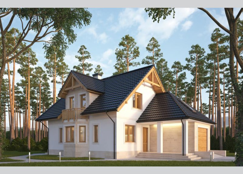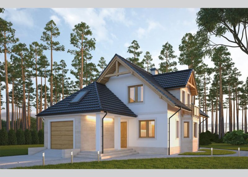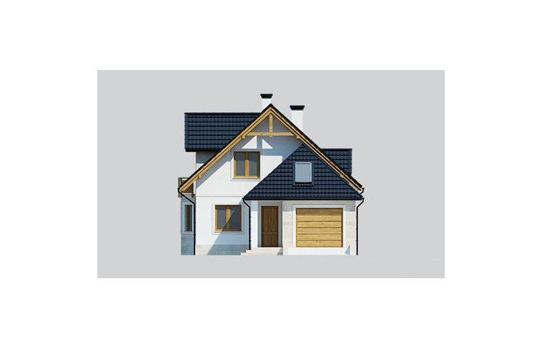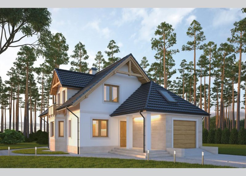 Dom jednorodzinny, parterowy z poddaszem użytkowym i jednostanowiskowym garażem.