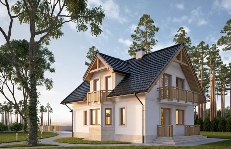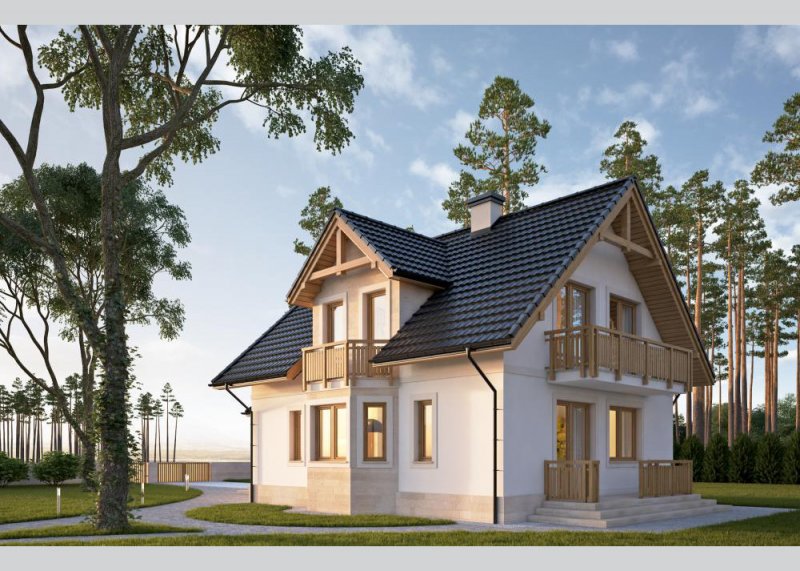 - Elewacje: wykończone tynkiem silikonowym, częściowo obłożone kamieniem naturalnym