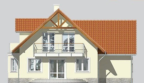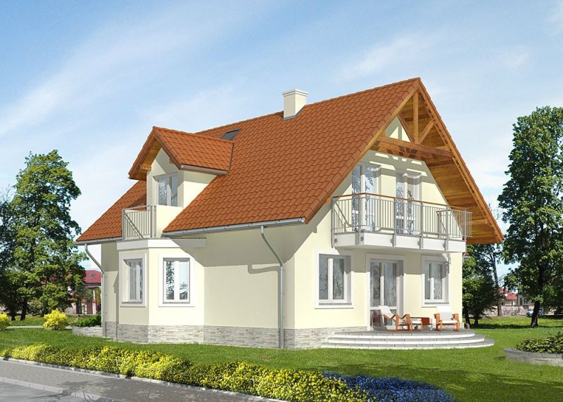 - Elewacje: wykończone tynkiem silikonowym, częściowo obłożone kamieniem naturalnym